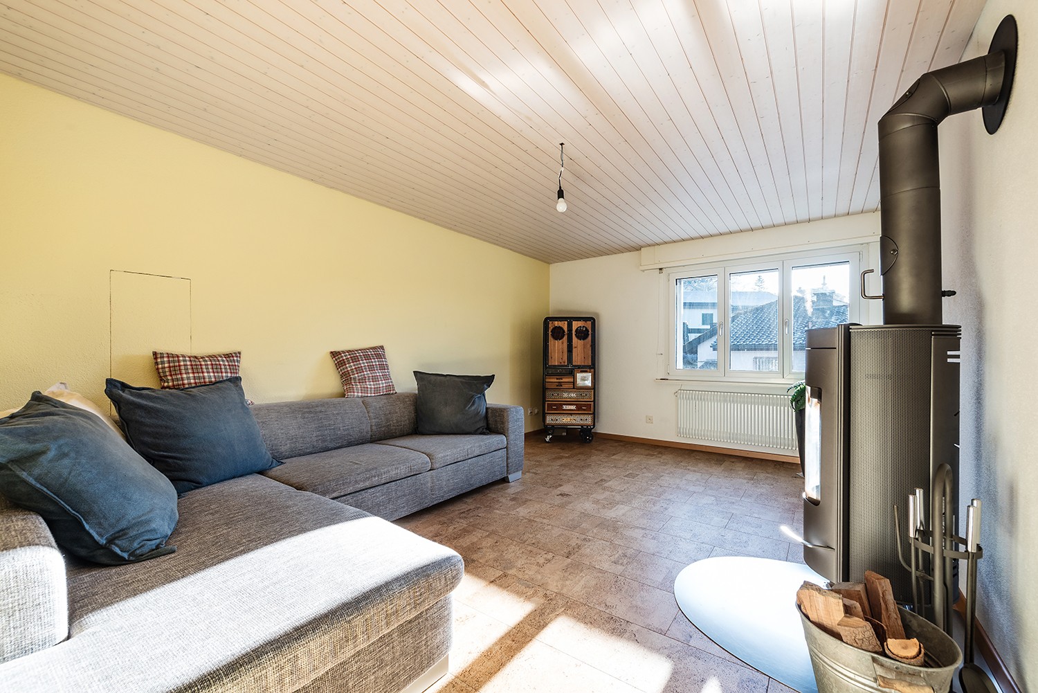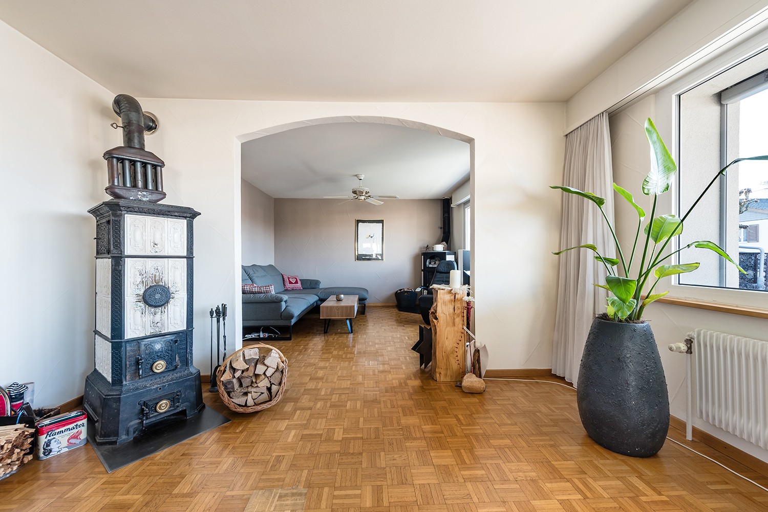 Der grosszügige Wohn- und Essbereich sorgt mit Kacheltragofen und Schwedenofen für eine gemütliche Atmosphäre. Ergänzt wird das Erdgeschoss durch ein Badezimmer sowie ein flexibel nutzbares Büro.