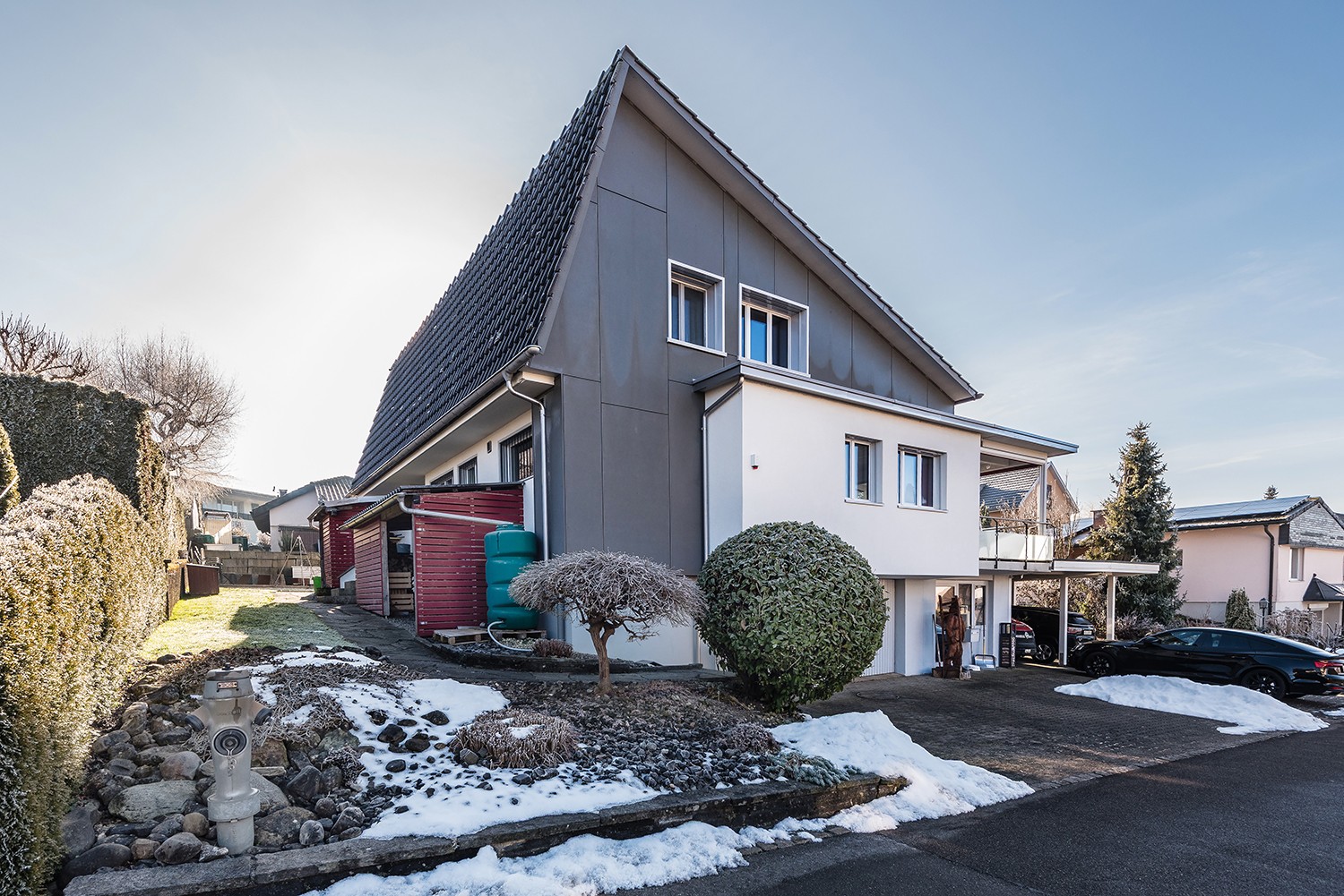 Carport für zwei Fahrzeuge sowie zwei Garagenboxen