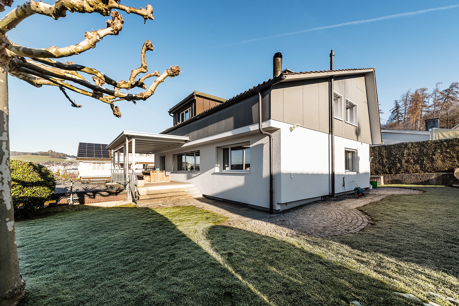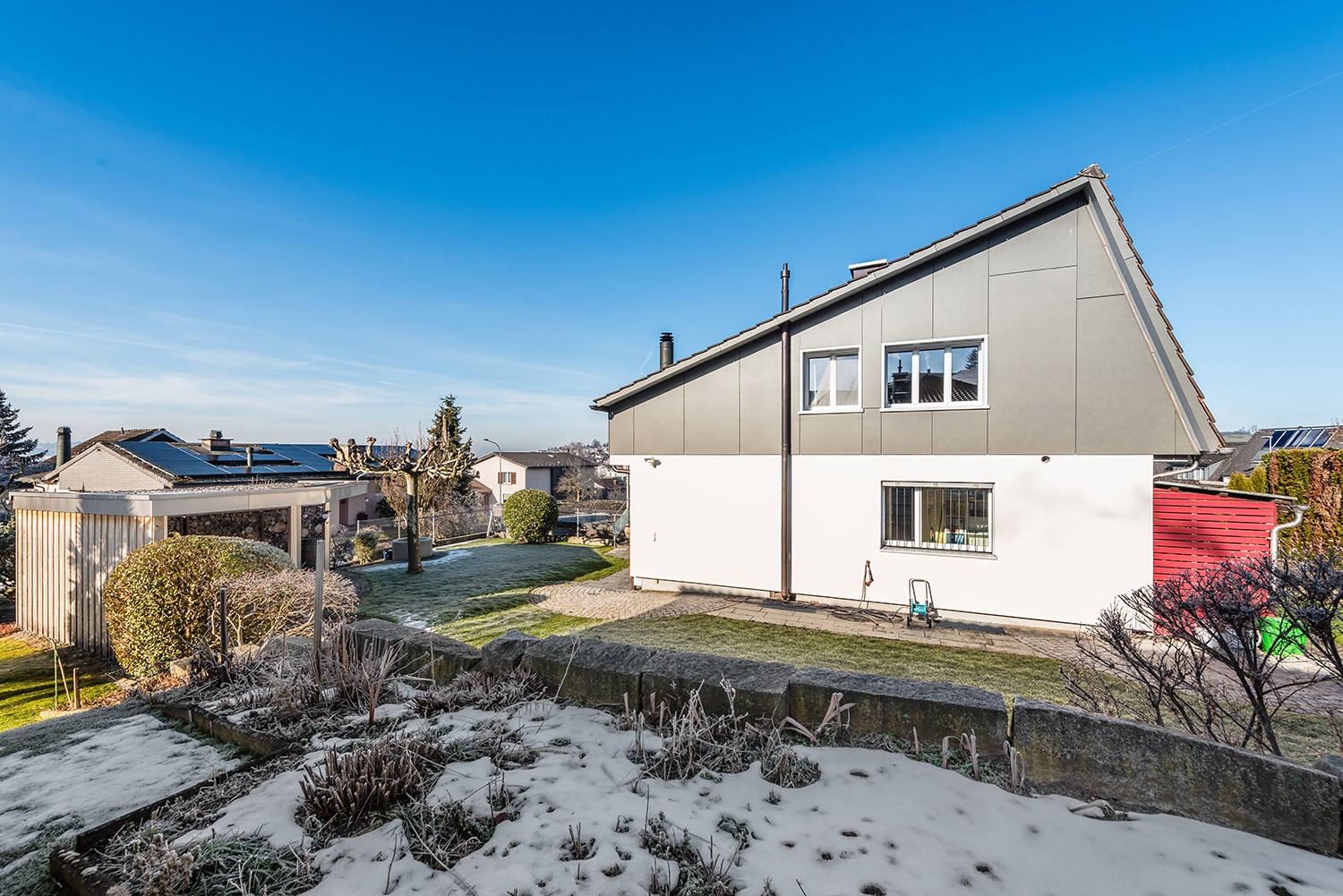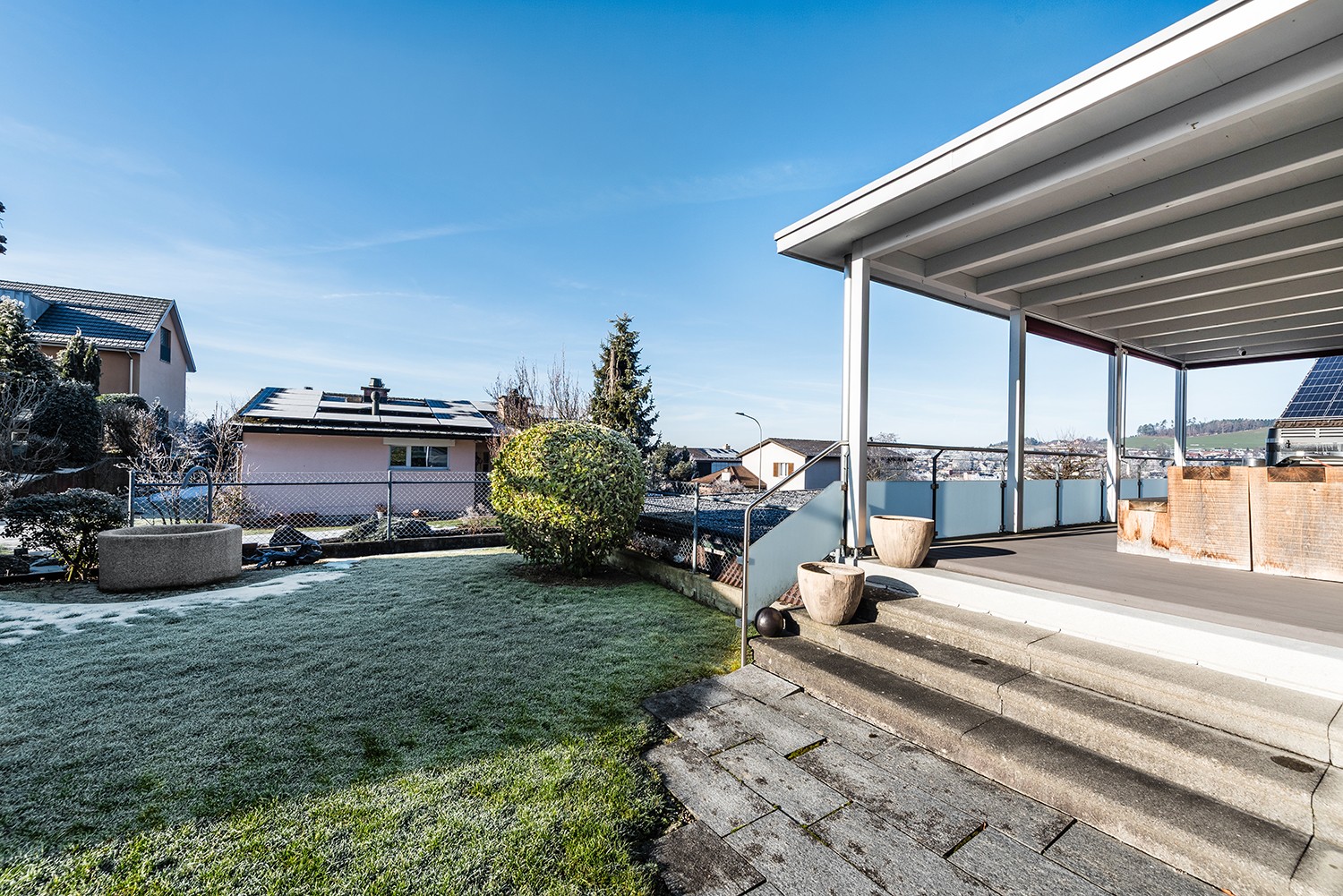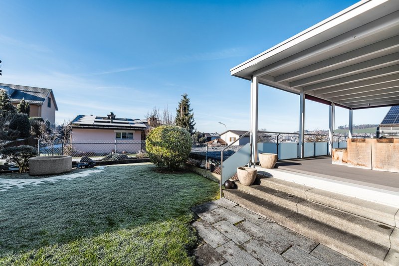 Der grosszügige Garten mit überdachtem Sitzplatz lädt zum Verweilen ein und bietet viel Platz für Erholung, Spiel und Freizeit.