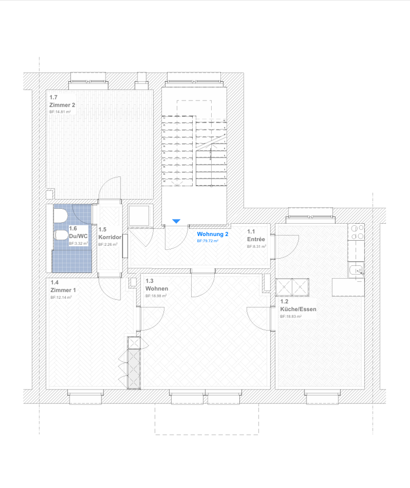 Die Wohnung umfasst 80m2 und zeichnet sich wie folgt aus: