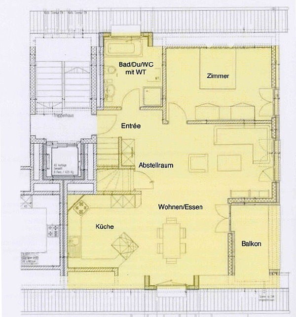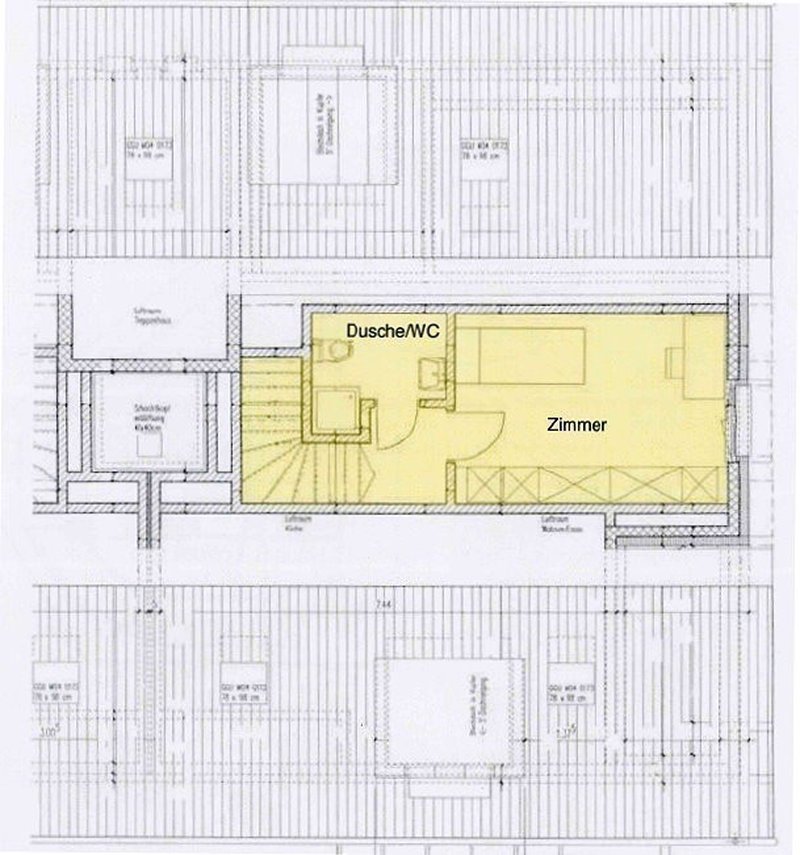 Die Wohnung gliedert sich im 1. Dachgeschoss in eine Entréezone, einen grossen Wohn- und Essbereich mit Balkon, eine offene und sehr geräumige Küche, ein Zimmer, eine Nasszelle (Badewanne, Dusche, WC, Waschmaschine und Tumbler) sowie ein kleiner Abstellraum.