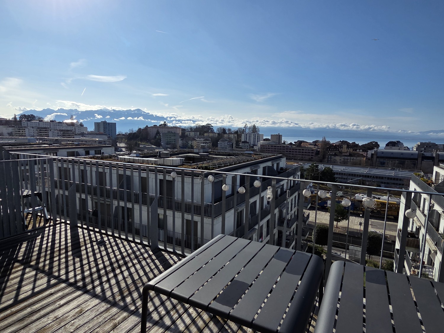 Appartement 2.5 pièce, 8ètage, avenue de Sévelin. Terrasse avec vue sur les Alpes et le lac.