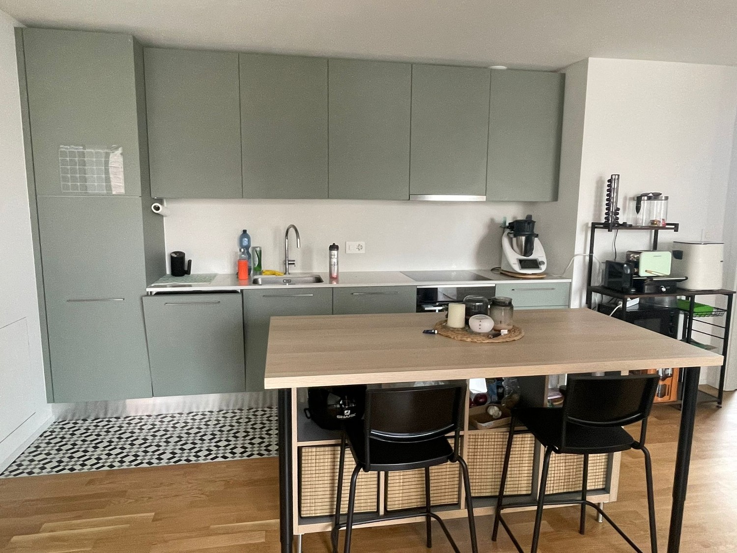 Full equipped kitchen and bathroom. Washing machine and tumbler shared with a few apartments free of charge.