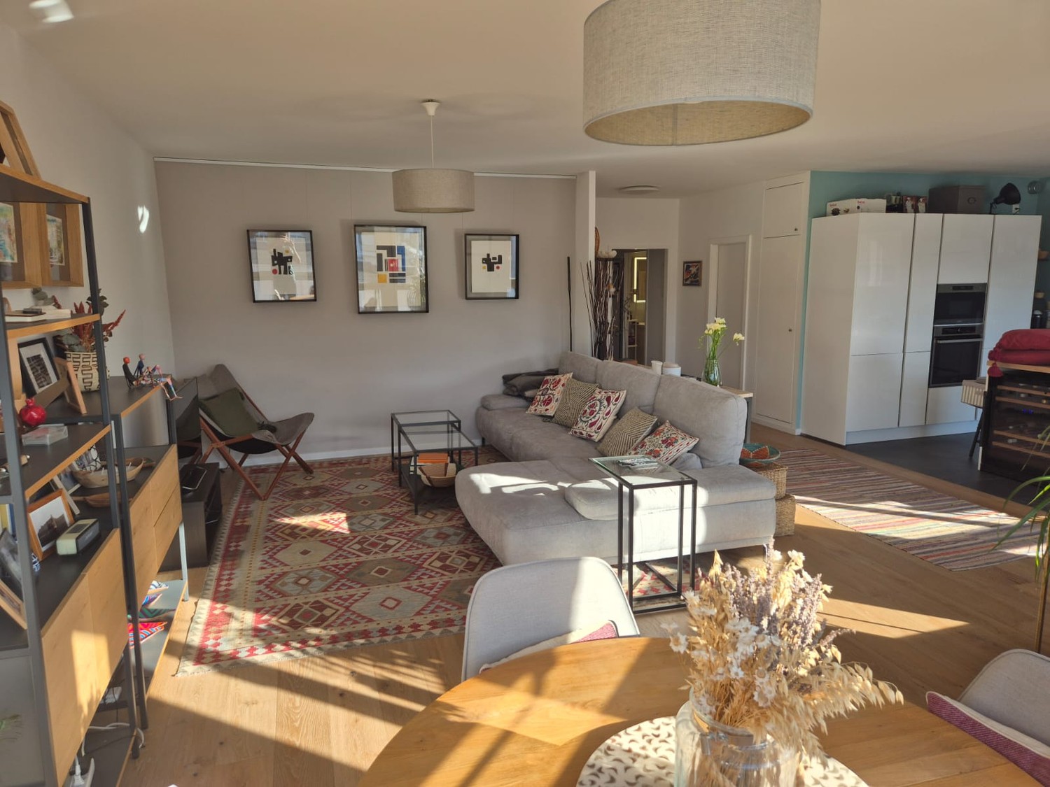 Spacious Living Area: Modern open-plan living room with beautiful wooden floors and large windows providing excellent natural light and nice views