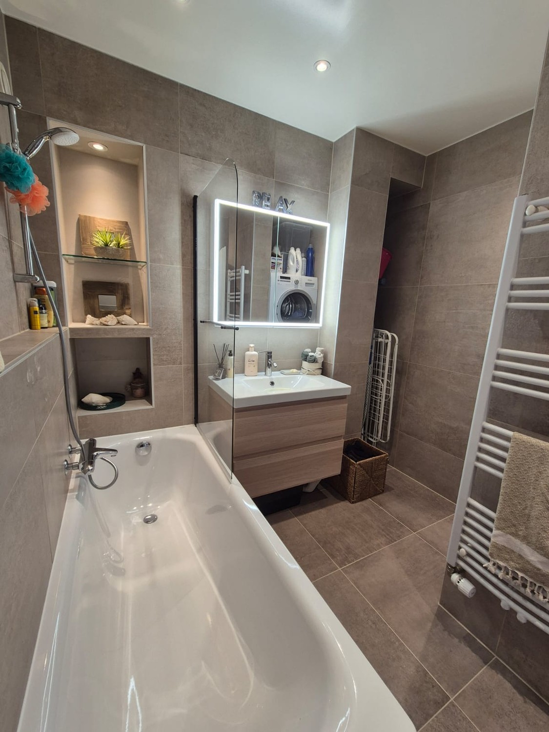 Modern Bathrooms: Elegant bathrooms featuring shower and bathtub, double sinks in the main bathroom, and contemporary fixtures