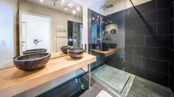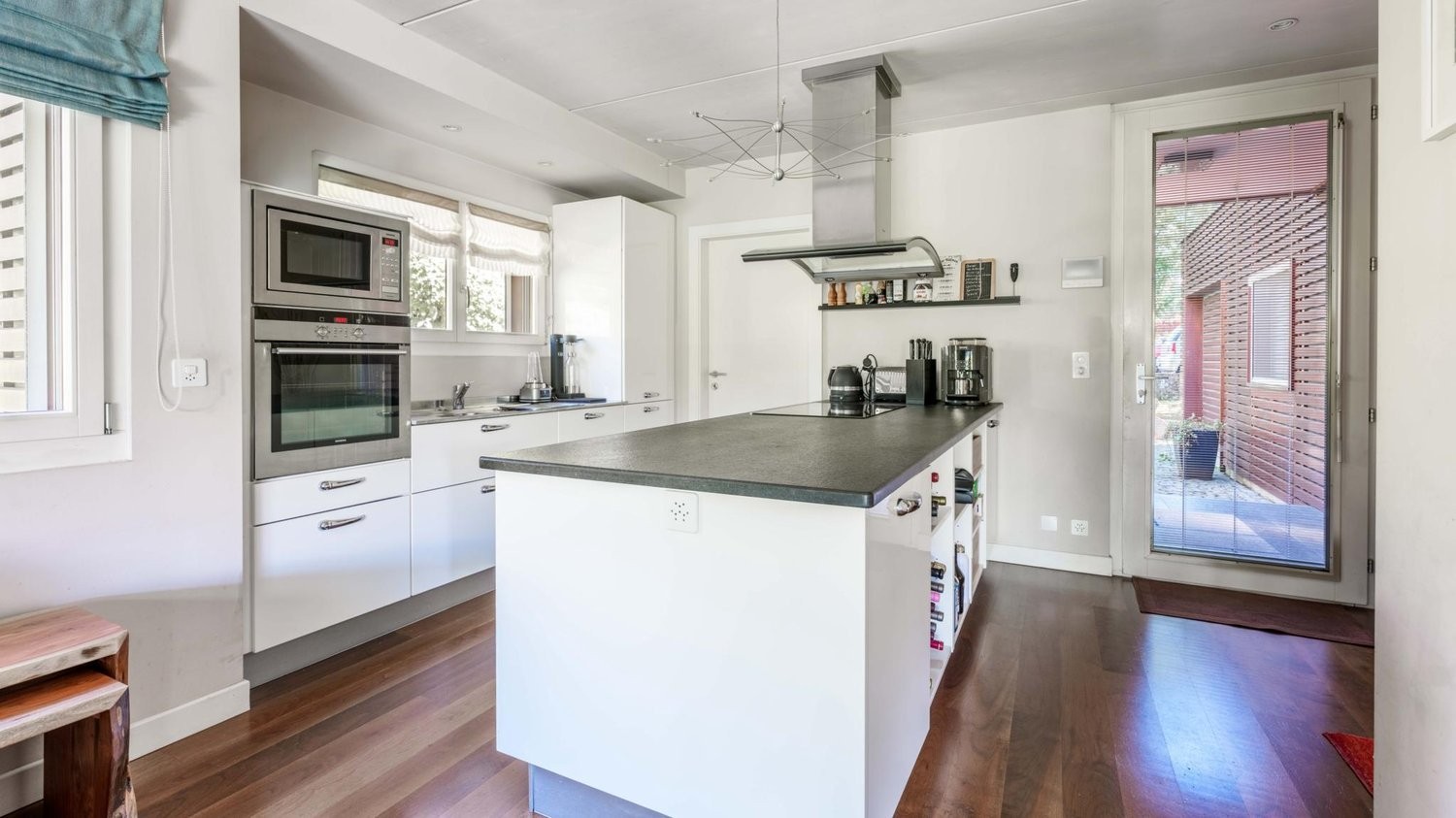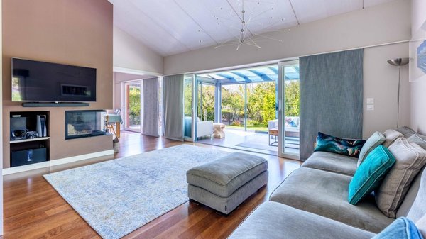 - Grande pièce de vie avec cuisine ouverte et un véranda chauffée ouvrant sur une terrasse ensoleillée.