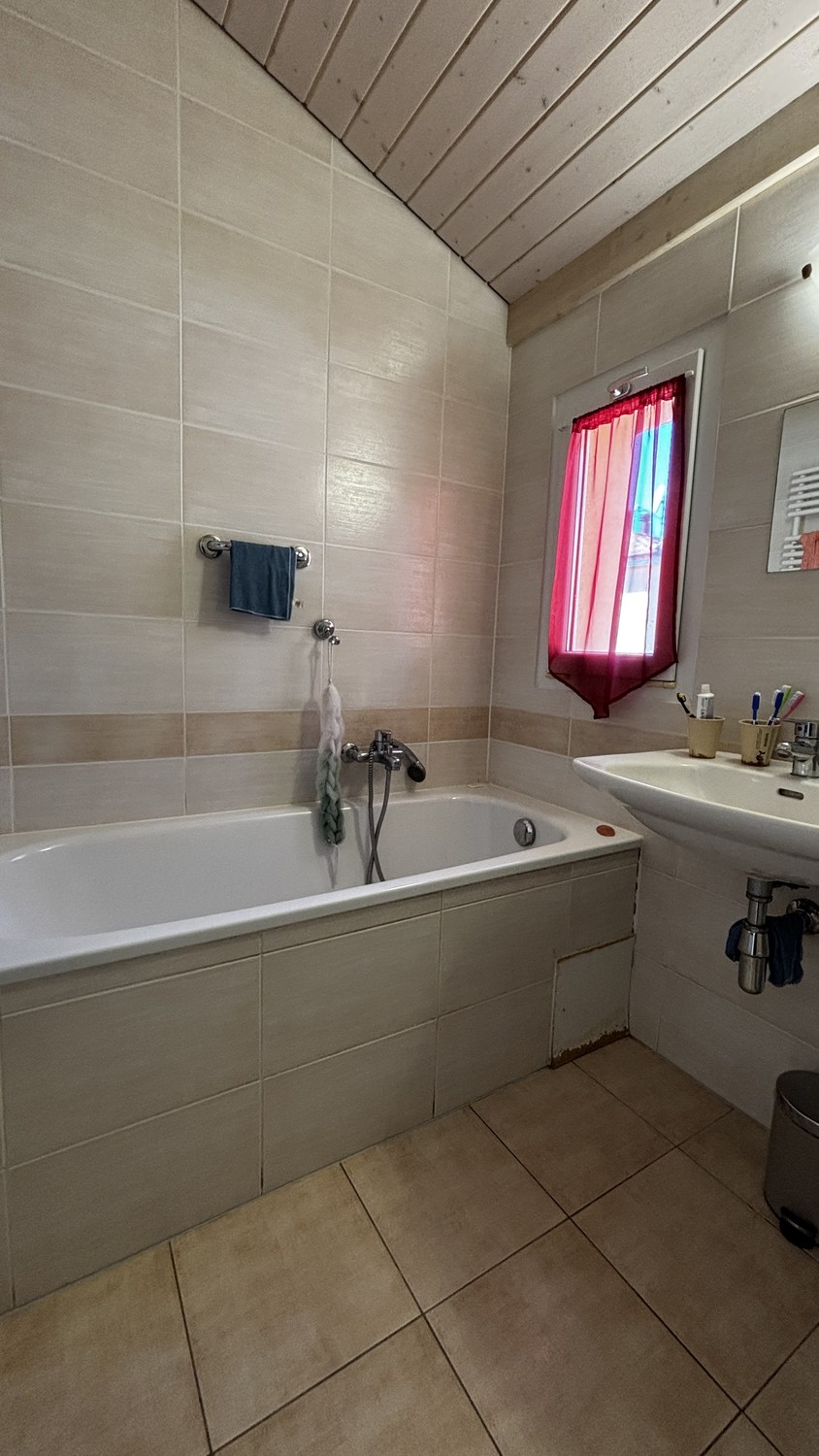 Trois chambres au plafond haut ainsi qu’une salle de bain et un autre wc séparé.