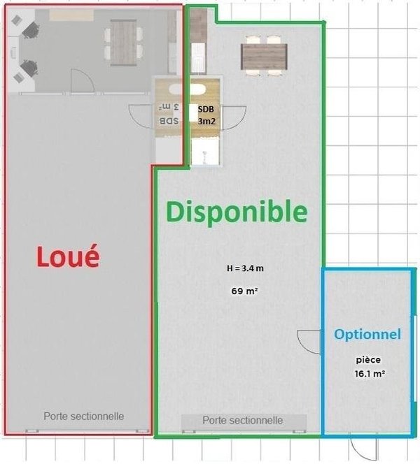 Possibilité de disposer d'un espace adjacent supplémentaire de 16m2 environ (en BLEU sur le plan), très lumineux (grande partie vitrée), avec accès extérieur séparé et possibilité de porte de communication intérieure. Supplément: Frs 400.-/mois, soit un loyer pour la surface totale de Frs 2'300.-/mois.