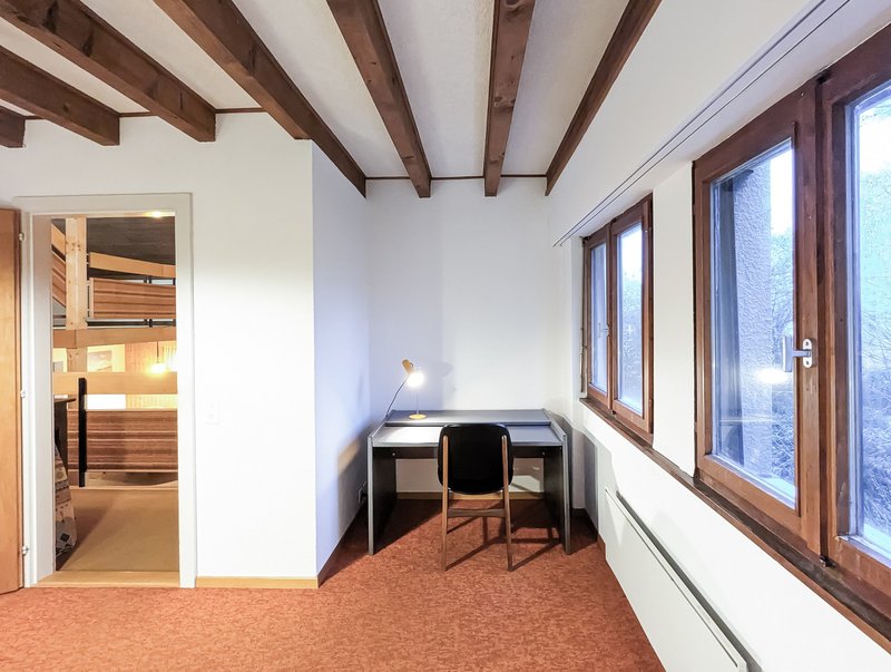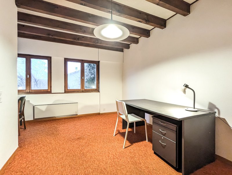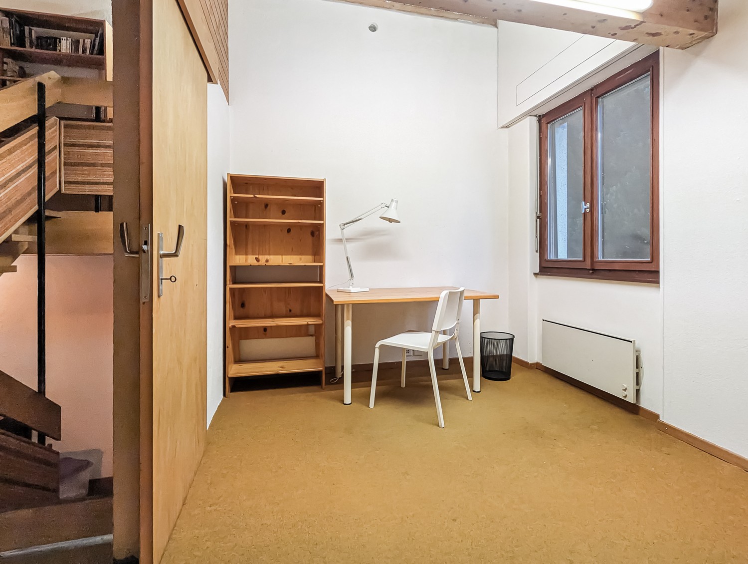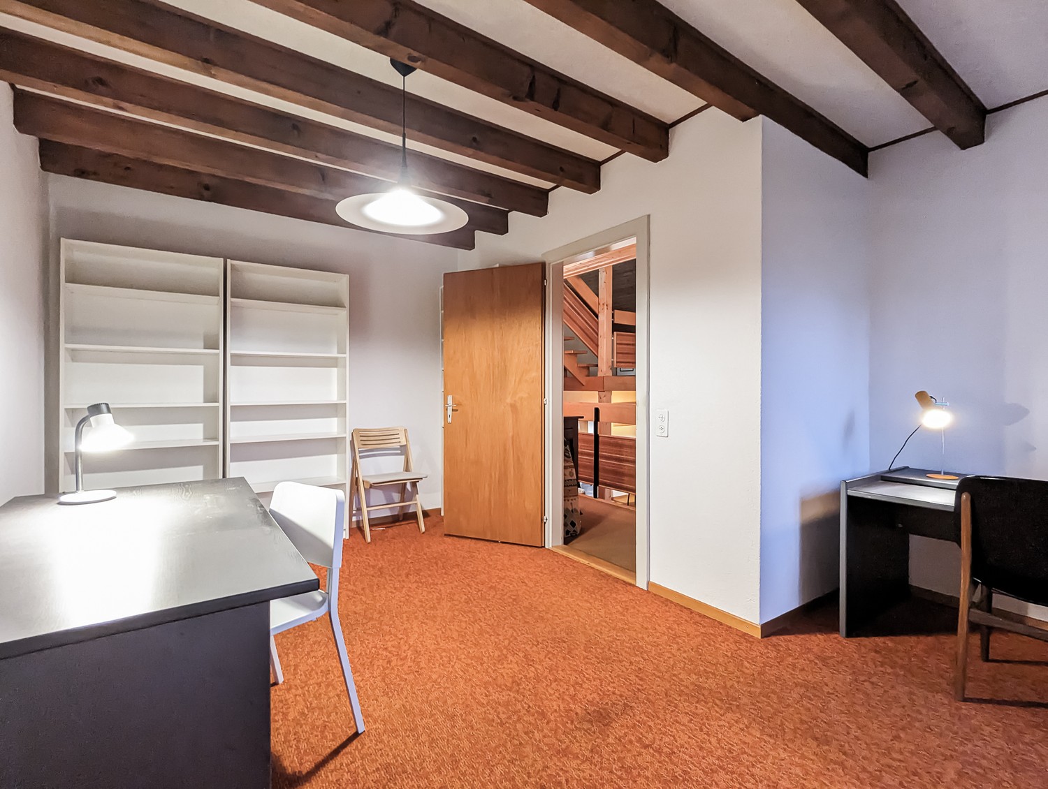Chambre au rez inférieur: 800 CHF + 170 CHF d’acompte de charges (ménage et fibre optique inclus), avec salle de bain privative (non attenante) et coin bureau aménagé.