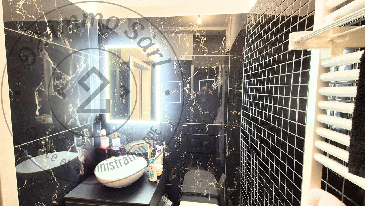 Salle de douche design avec finitions marbre noir & robinetterie laiton