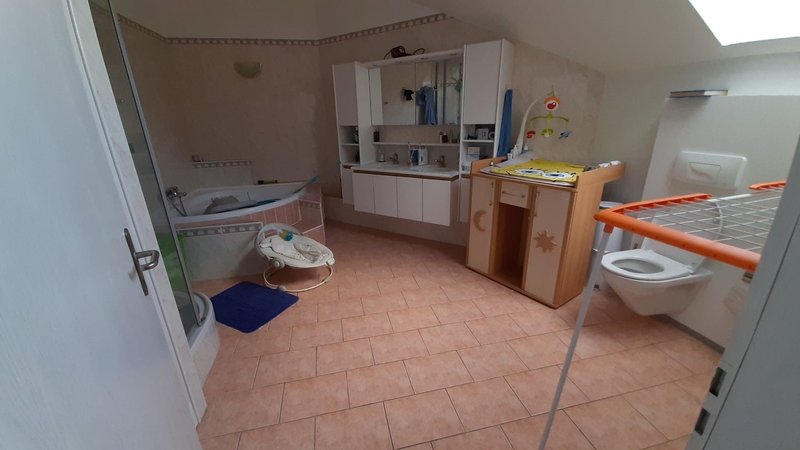 1 grande salle de bain avec douche et baignoire dangle et branchement pour colonne de lavage