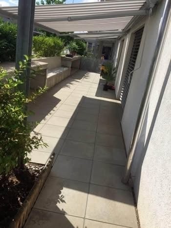- Grande terrasse : Un espace extérieur privé de 37m² avec sol carrelé, banc en pierre et plantes, protégé par un auvent - idéal pour se détendre