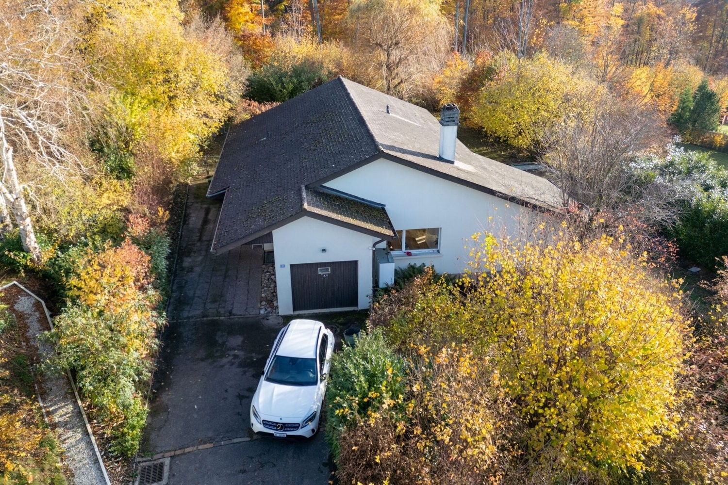 Auf der Zugangsseite der Parzelle runden angenehme Platzverhältnisse für mindestens drei Fahrzeuge im Aussenbereich und die Garage mit einem Platz das Angebot ab.