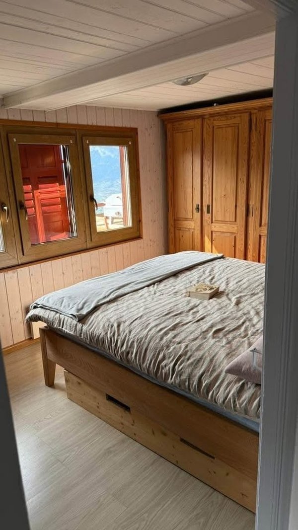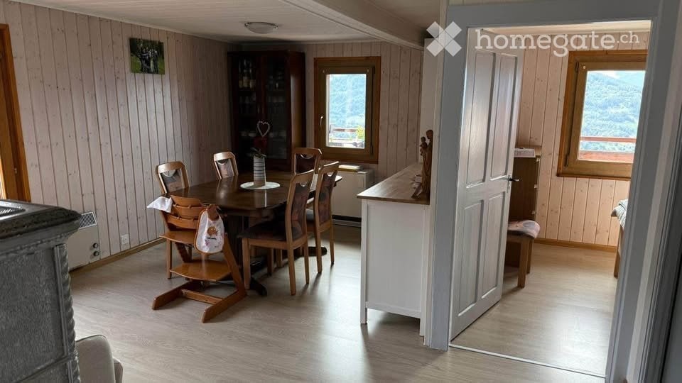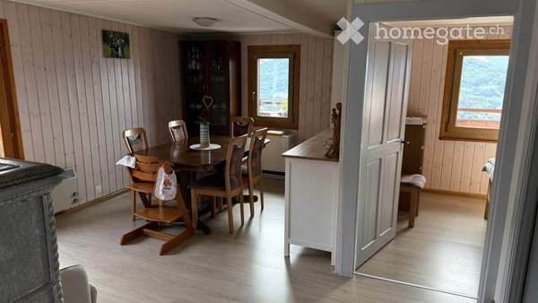 - 1 séjour avec pierre ollaire (se charge depuis la cuisine) et un grand balcon sur toutes les façades sud et ouest (vue à couper le souffle, sur le Val d'Hérens et la vallée du Rhône)