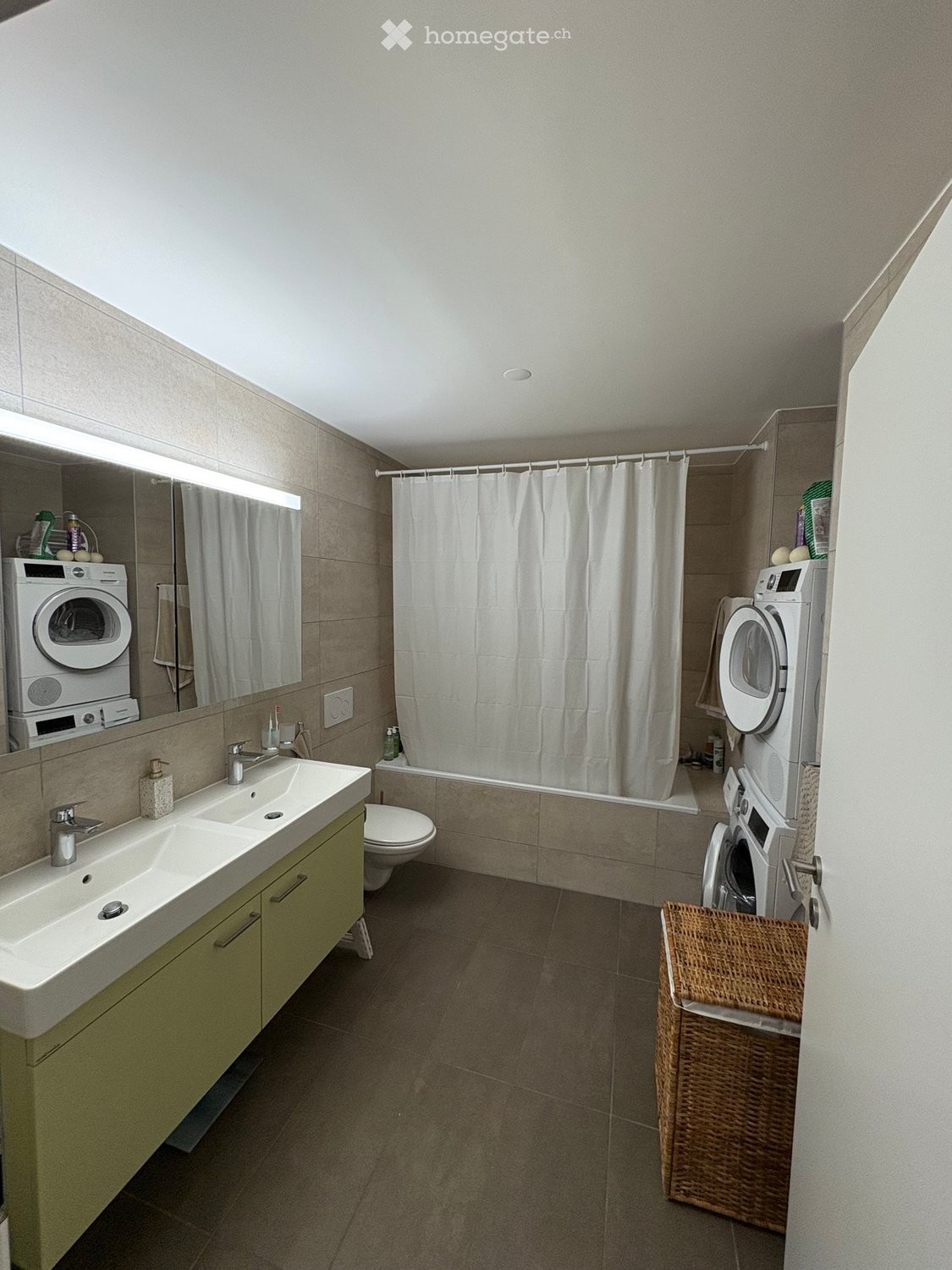 - Salle de bain complète : Avec double lavabo, baignoire, branchement et renfoncement pour colonne de lavage et éclairage moderne
