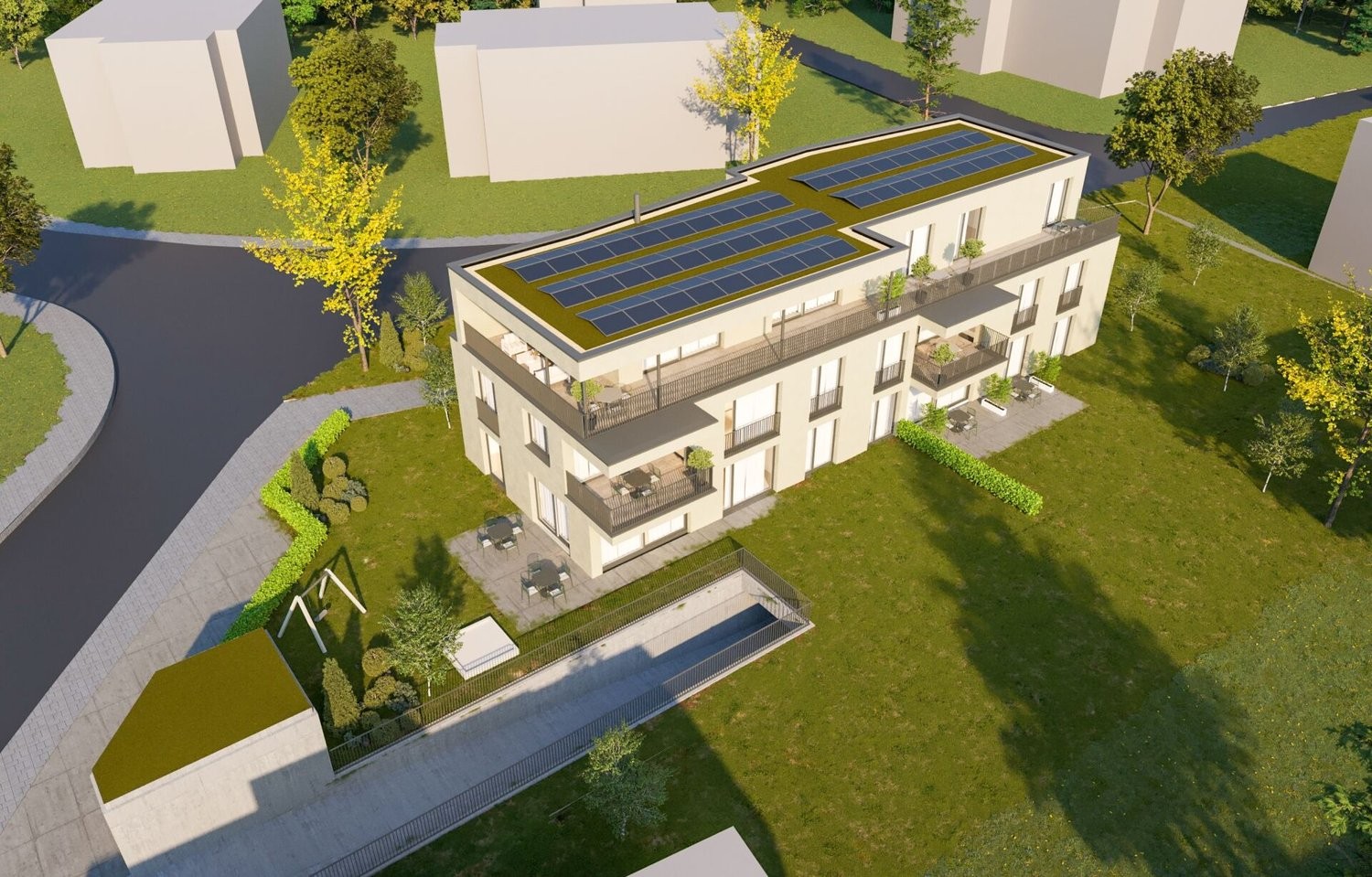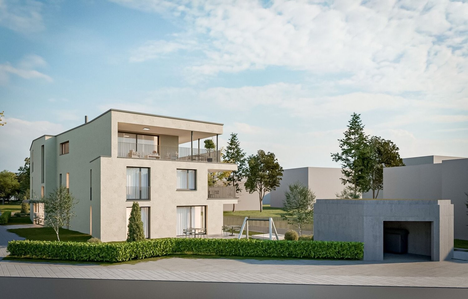 • Grosszügig dimensionierte Aussenbereiche: Schöne Balkone in den oberen Etagen und eigene Gartenanteile der Gartenwohnungen