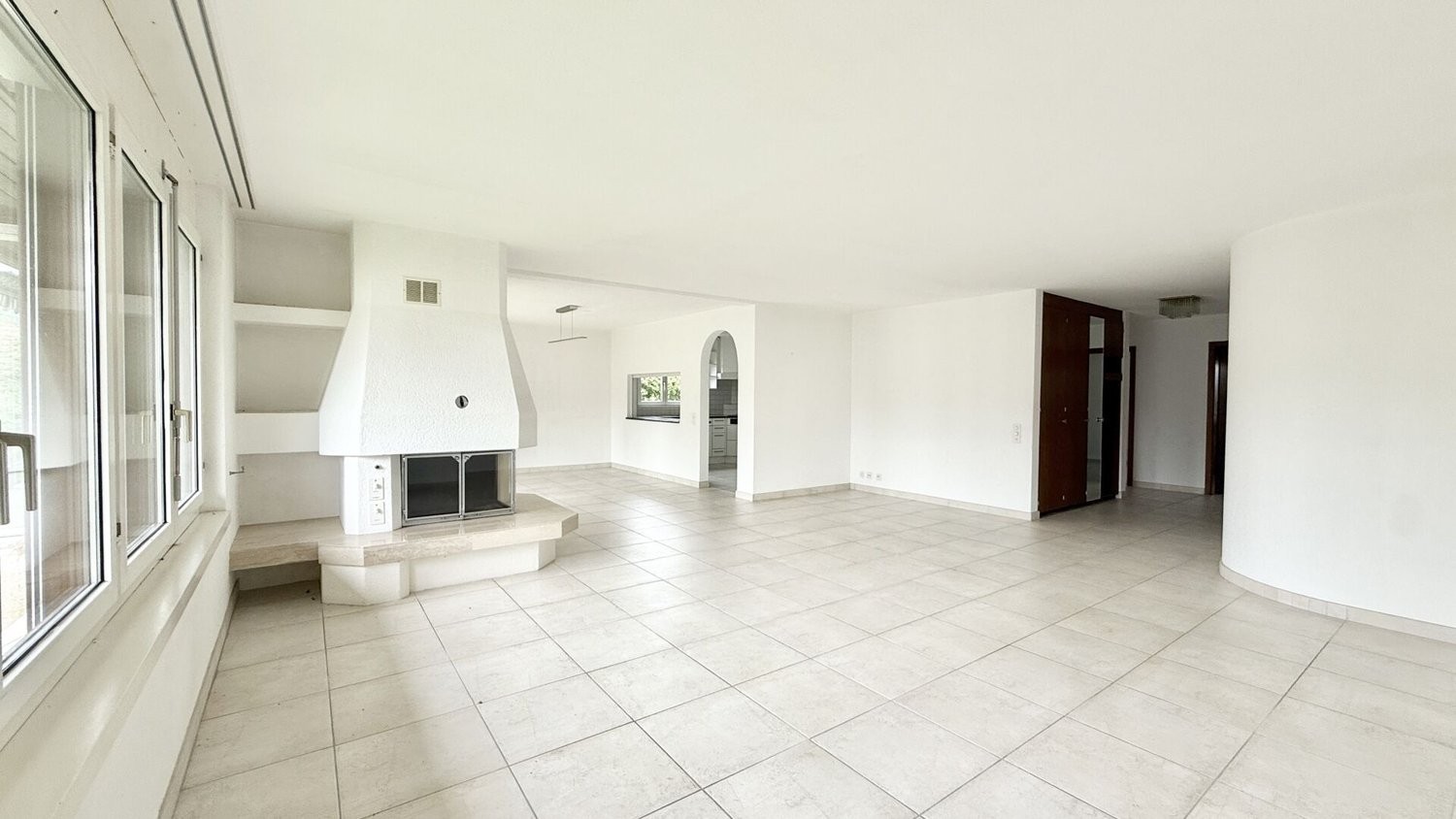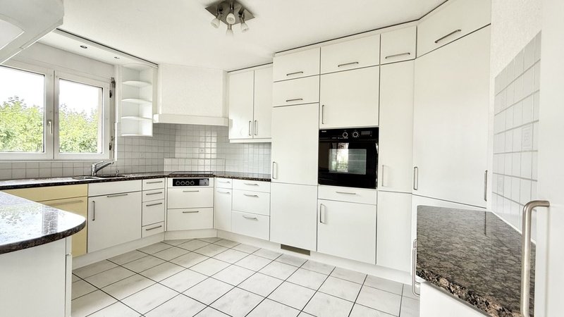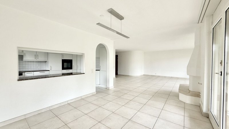 Das Herzstück der Wohnung bildet der weitläufige Wohnbereich mit grossen Fensterfronten, die viel Tageslicht hereinlassen, sowie einem wunderschönen Cheminée, das für eine gemütliche Atmosphäre sorgt. Die offene, sehr geräumige Küche bietet Ihnen viel Platz zum Kochen und lässt keine Wünsche offen - ideal für Familien oder Menschen, die gerne und oft Gäste empfangen.