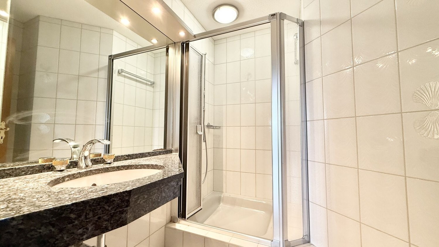 Die Wohnung verfügt über drei helle Schlafzimmer, eines davon mit direktem Zugang zu einem der beiden Badezimmer. Die beiden Badezimmer sind modern ausgestattet, eines mit Badewanne und zwei Lavabos, das andere mit einer komfortablen Dusche.