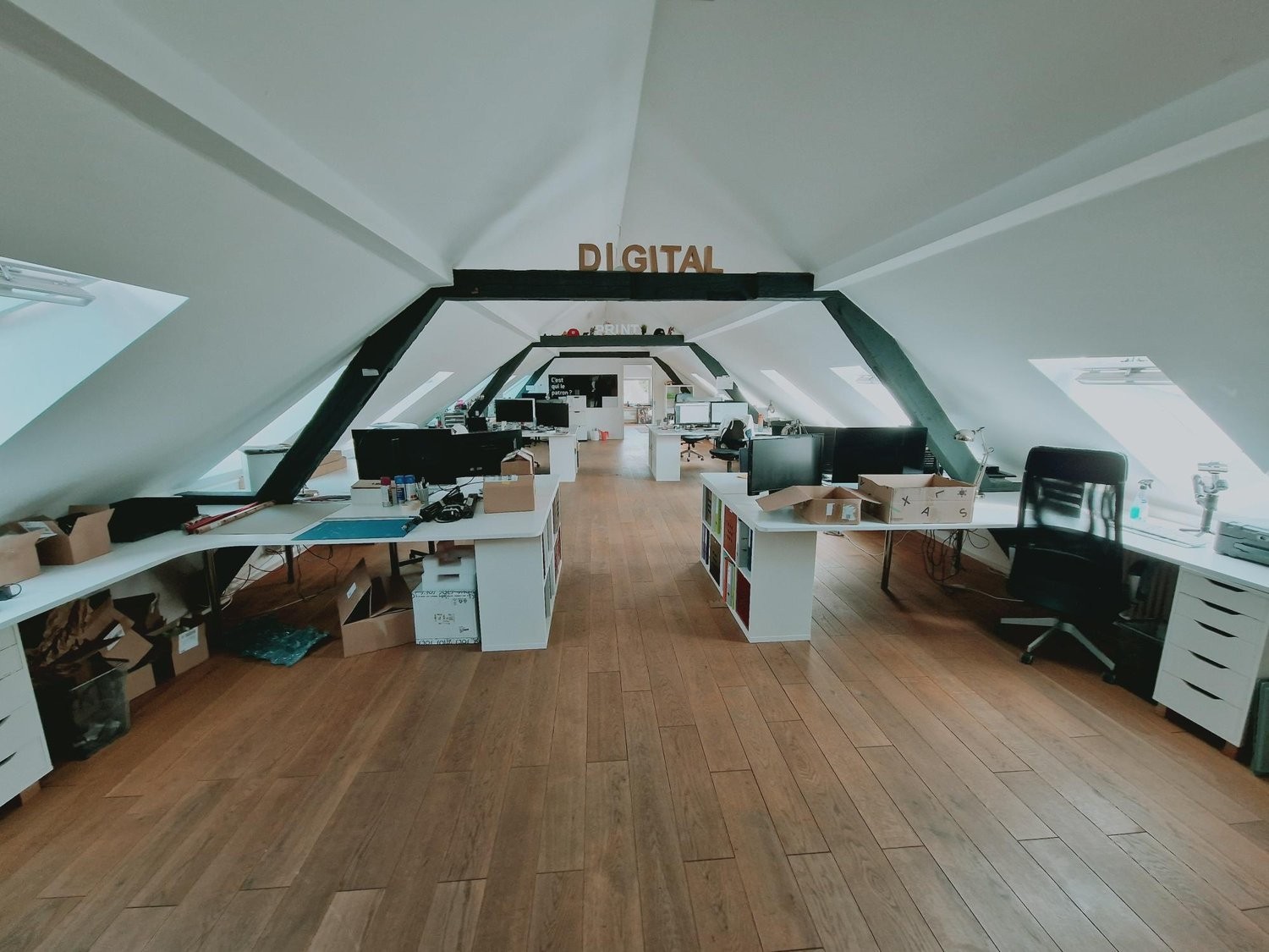 Espaces de travail lumineux : Trois pièces spacieuses avec parquet en bois, plafonds mansardés et poutres apparentes créant une atmosphère chaleureuse et moderne