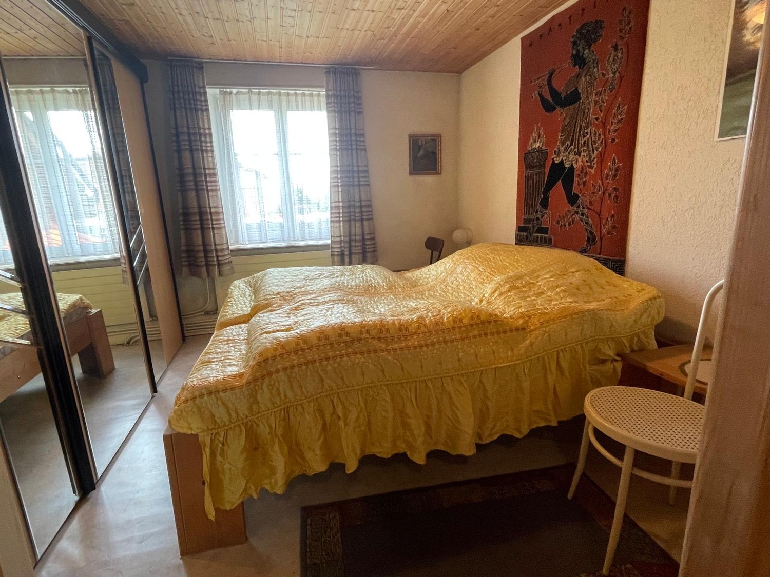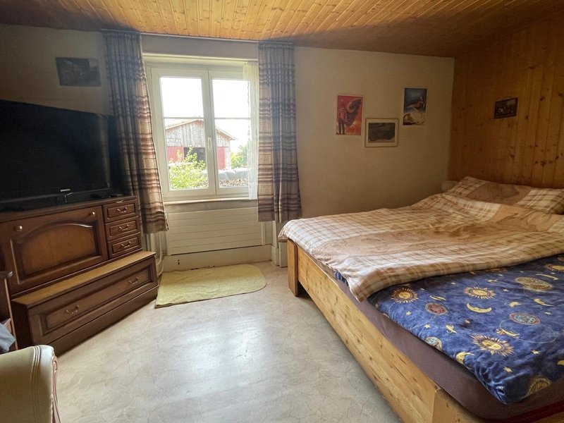 Ein grosses Schlafzimmer mit eigenem Badezimmer (Badewann und WC), zentraler Raum, der das Schlafzimmer und das Büro verbindet.