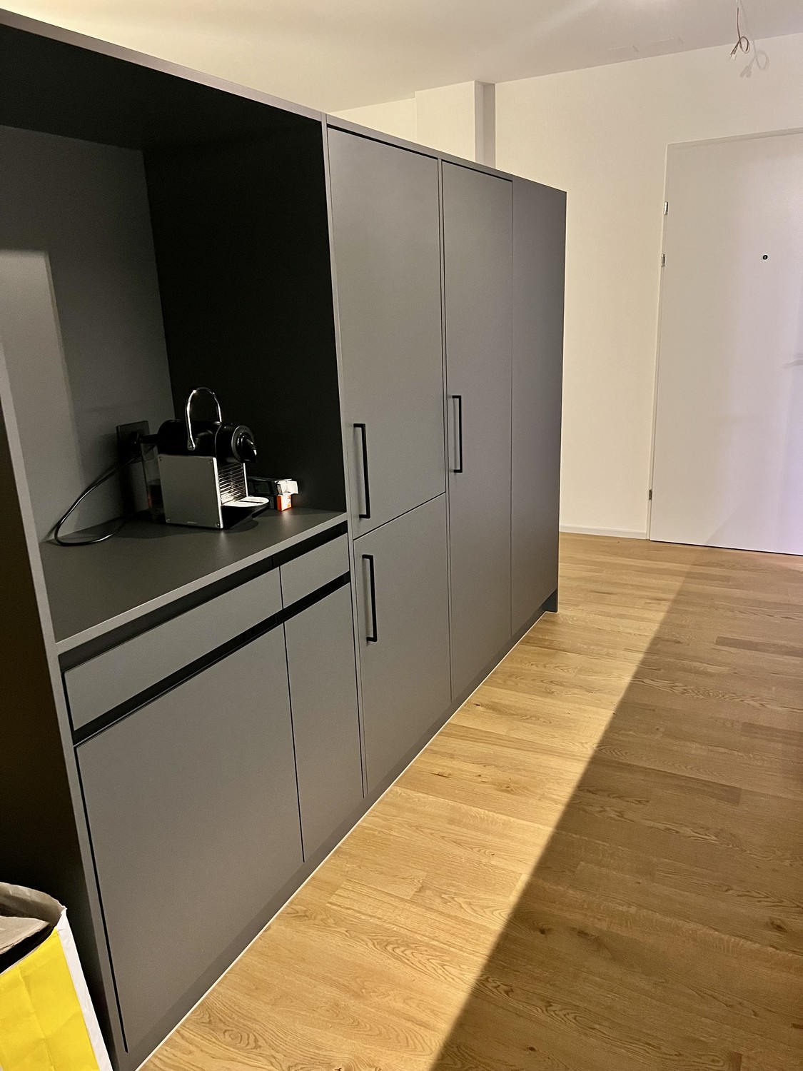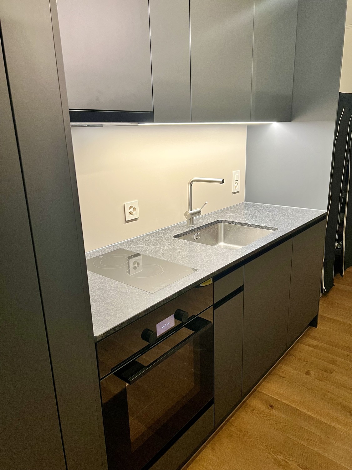 – Moderne Küche mit anthrazitfarbenen Fronten, Granit-Arbeitsfläche und hochwertigen V-ZUG-Geräten (Glaskeramikkochfeld, Einbaubackofen, Geschirrspüler, Kühlschrank mit Gefrierfach)