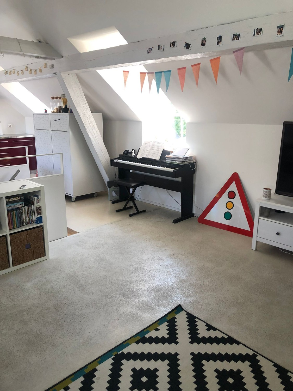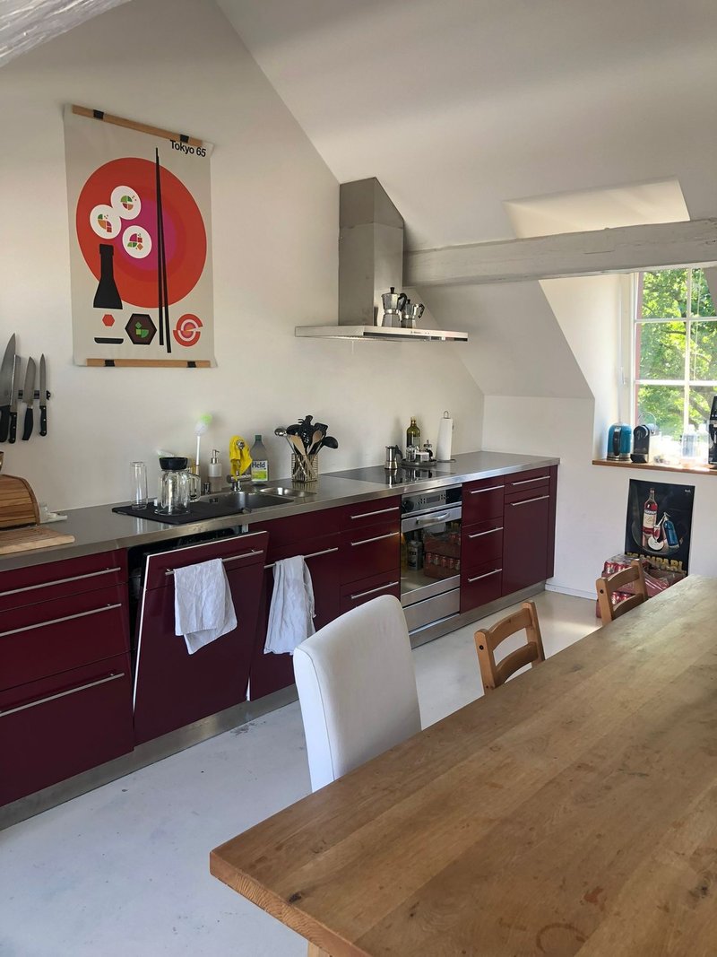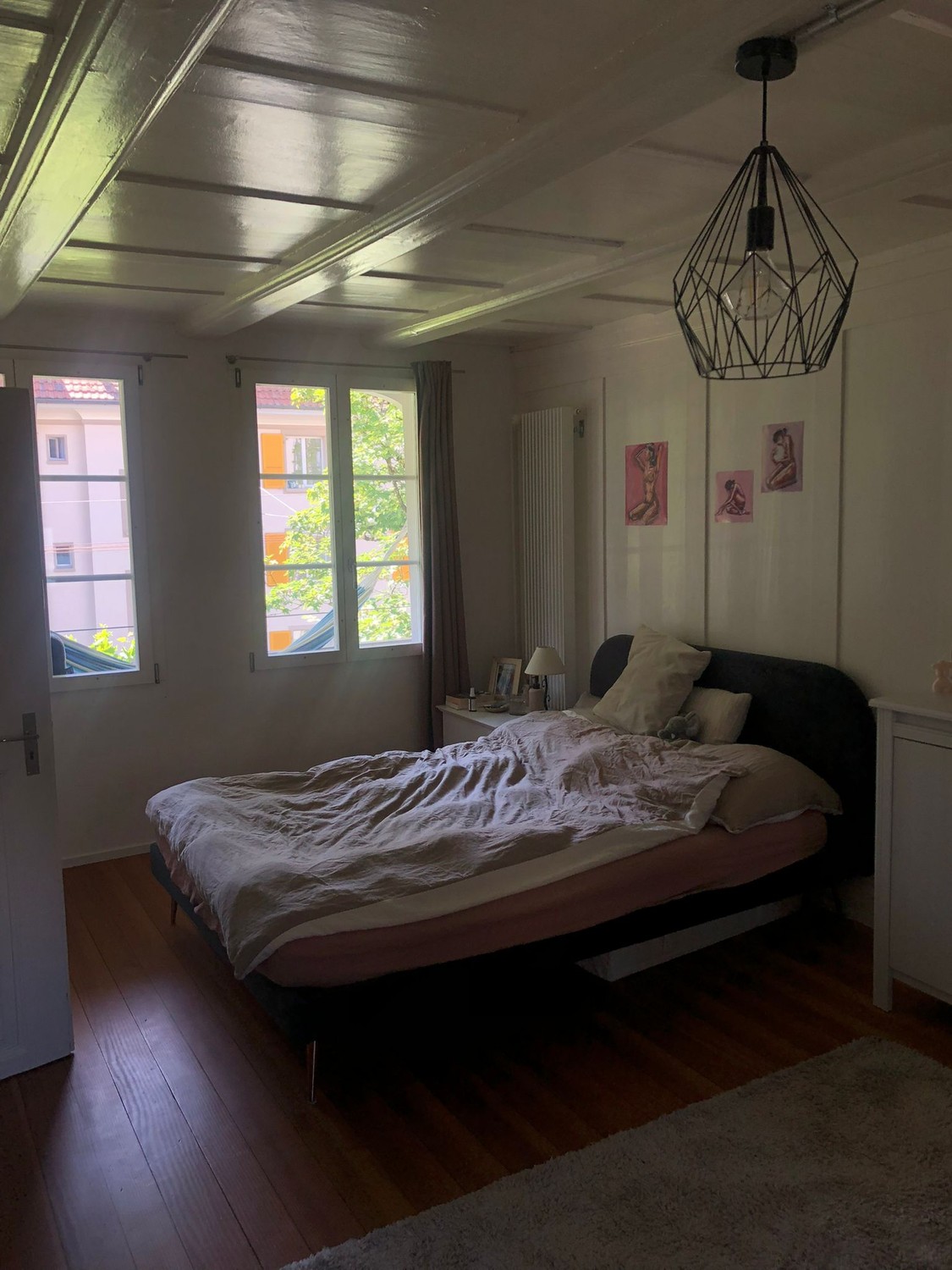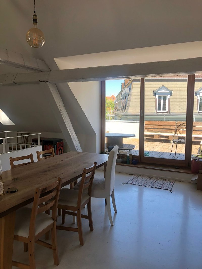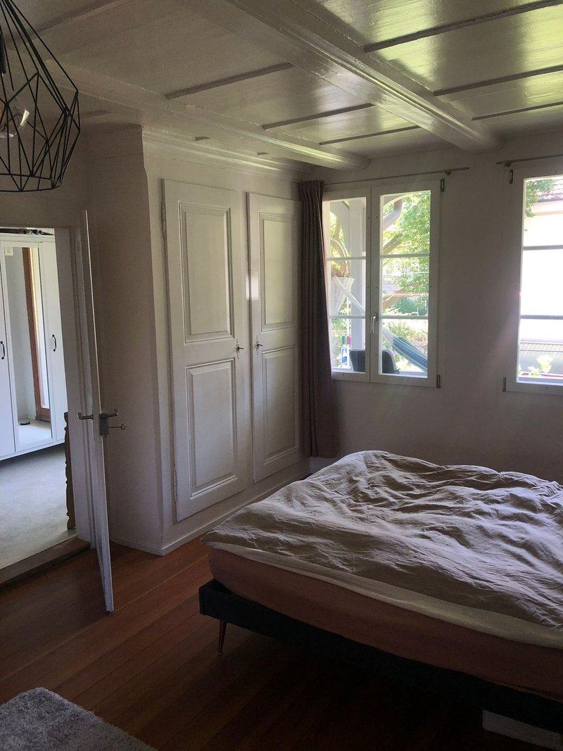 Hat einen schönen alten Parkettboden und eine weisse Holzdecke. Dank der beidseitigen Fenster ist der Raum angenehm hell. Er ist gesamthaft 19 m2 gross. Das Zimmer ist Teil einer schönen 4.5-Maisonette-Wohnung. Im oberen Stock wohnen wir mit offener Küche und geräumiger Stube unter dem Dach und es hat eine grosse Dachterrasse mit Abendsonne. Im unteren Stock hat es zwei Bäder, die drei Schlafzimmer und einen zusätzlichen Balkon. Ein grosser Umschwung mit Garten steht dem ganzen Haus (4 Mietparteien) zur Verfügung und darf zum gärtnern, grillen oder Kubb spielen genutzt werden. Das Zimmer ist ab 1.April verfügbar, könnte jedoch auch per 16.März oder nach Absprache Ende April bezogen werden.