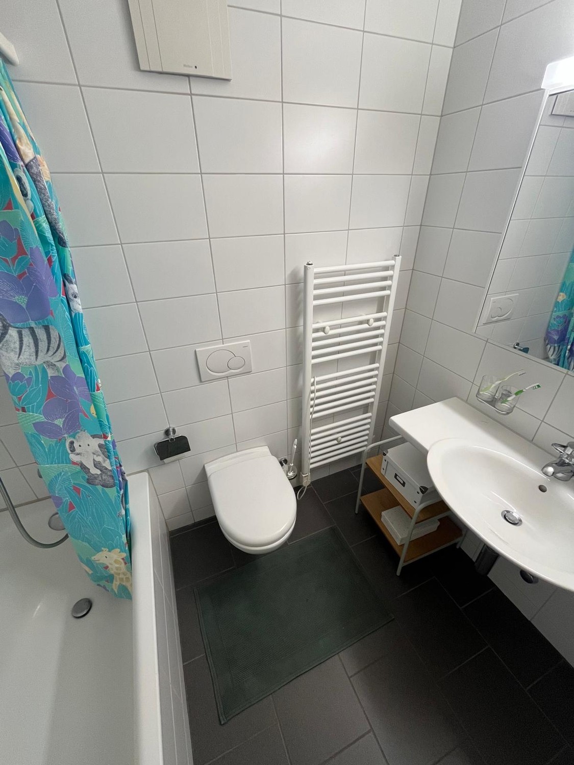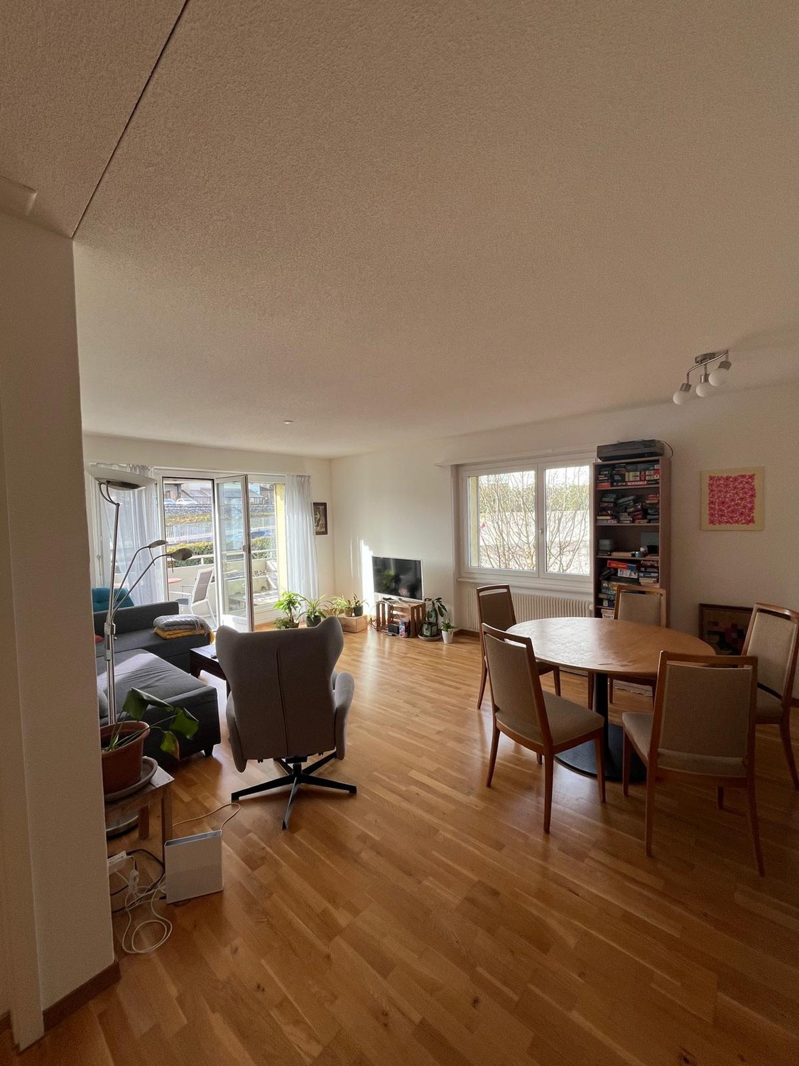 Das Zimmer ist 19.2 Quadratmeter gross mit eigenem Bad inkl. Badwanne/Dusche und einem eigenen Balkon. Die WG liegt im 1. Stock mit zwei weiteren Balkonen und einem offenen Wohnzimmer. Zur Wohnung gehört eine Garage, Kellerabteil und eigene Waschmaschine. Die Garage benutzen wir für die Velos und als Abstellraum.