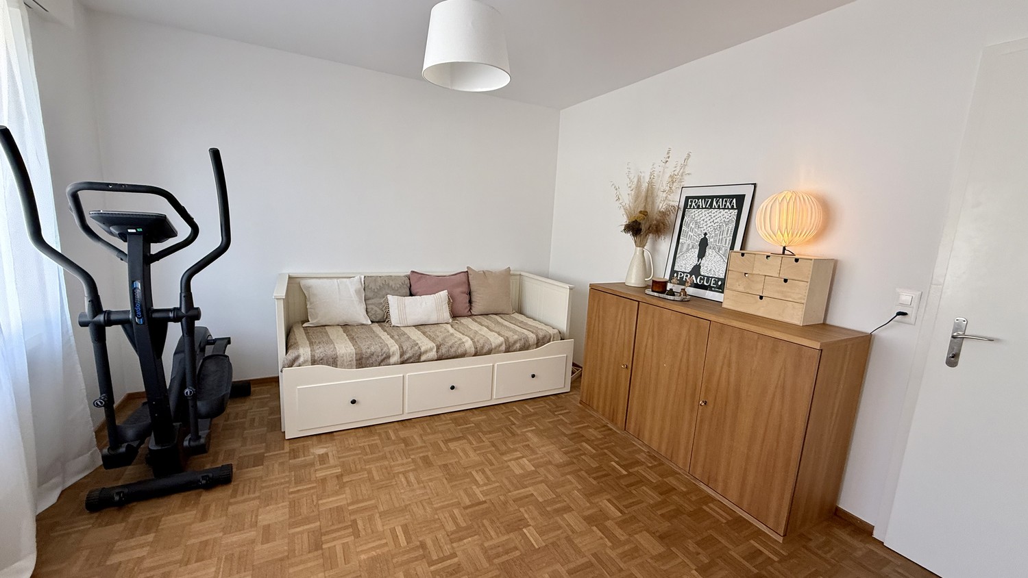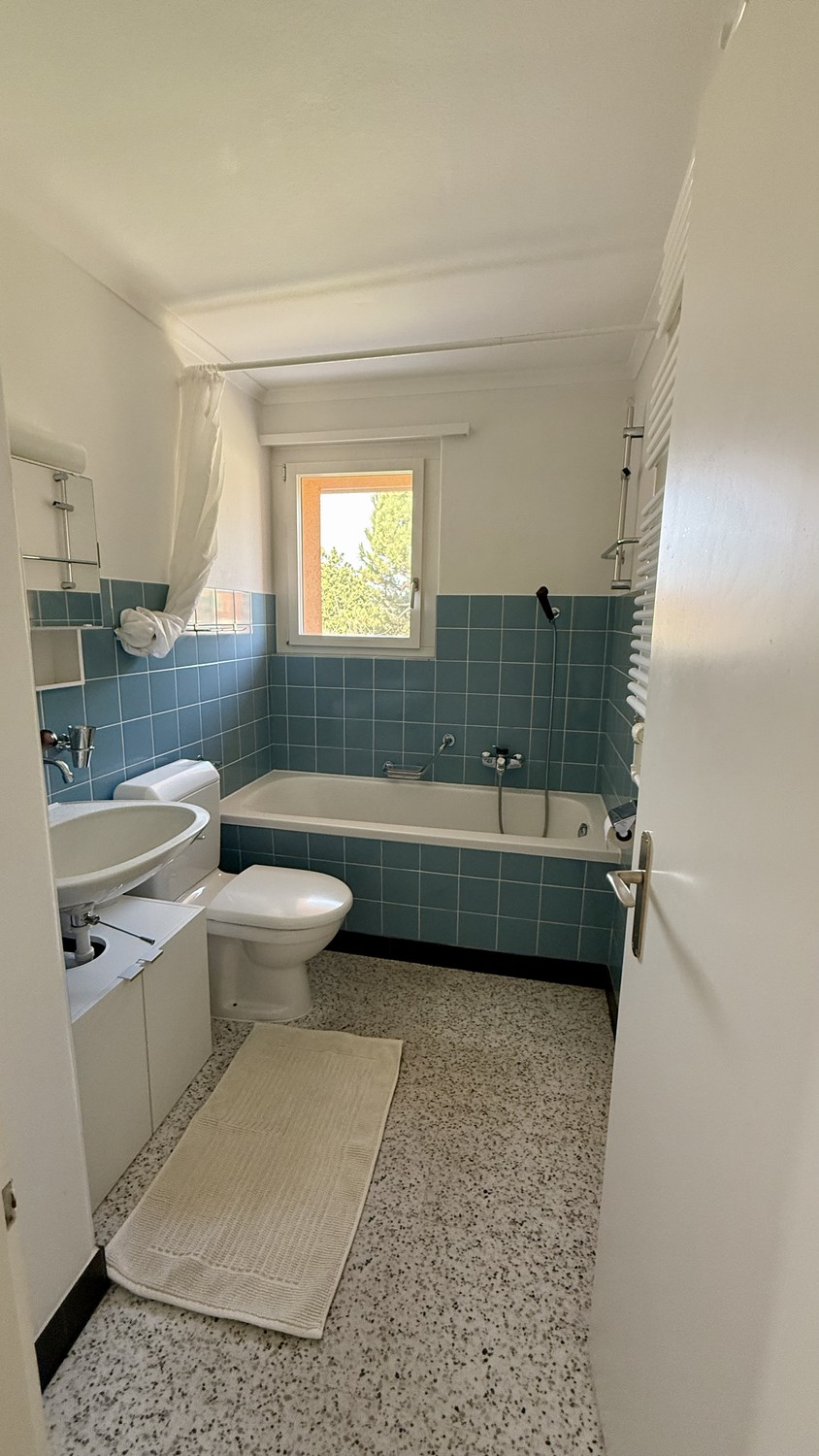 Deine Zimmer & dein Bad Dein erstes Zimmer (17,5 m²) hat einen direkten Balkonzugang mit Blick ins Grüne und auf die Alpen. Dein zweites Zimmer misst 13,5 m². Beide Zimmer verfügen über Parkettboden und elektrische Storen. Dazu gehört ein eigenes, privates Bad mit Badewanne – ganz für dich allein.