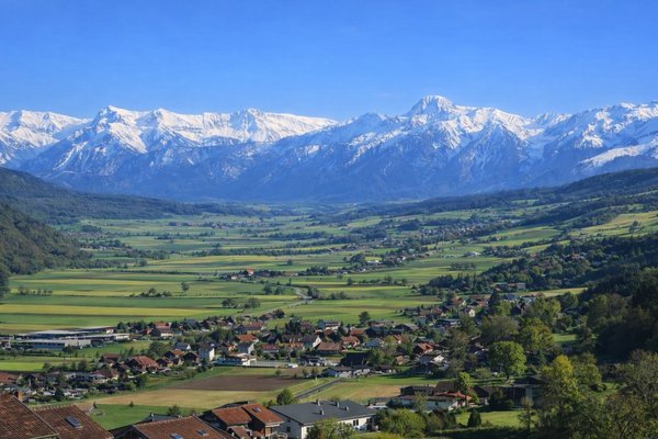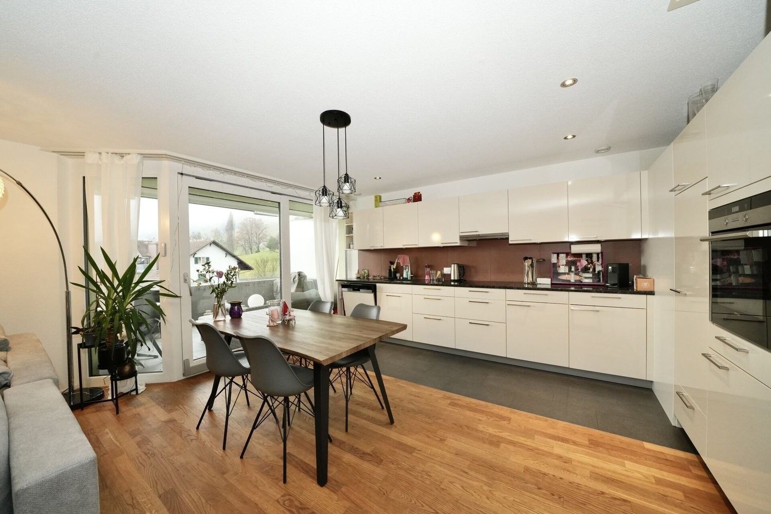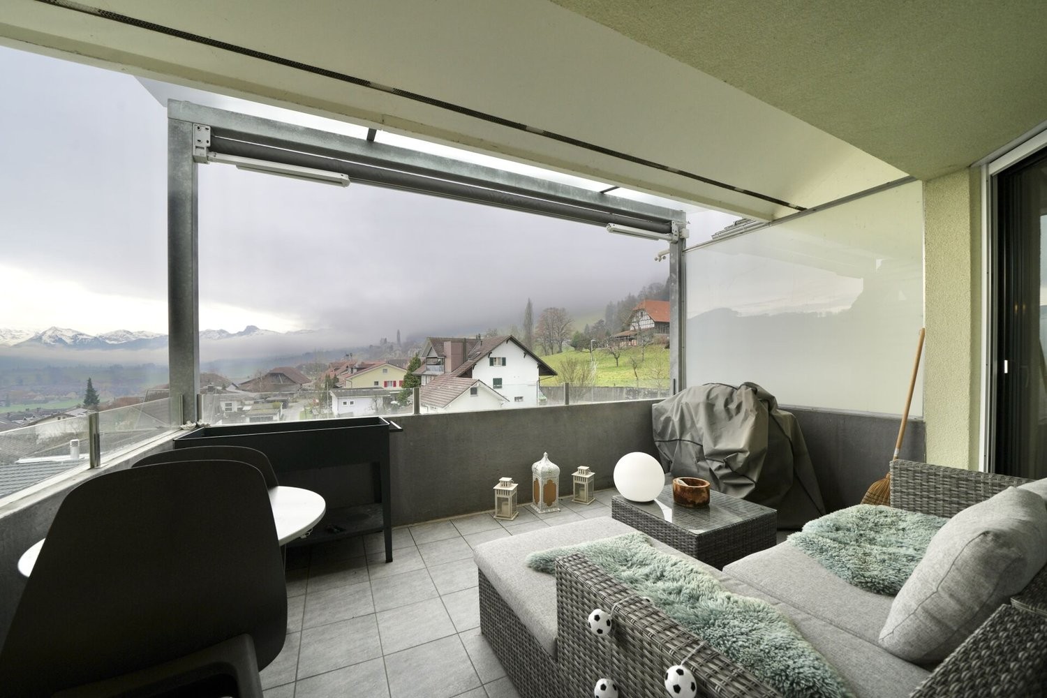 Ein besonderes Highlight ist der grosszügige Balkon, von dem aus sich eine atemberaubende Sicht auf die Berner Alpen eröffnet und der den Wohnraum ideal nach aussen erweitert.