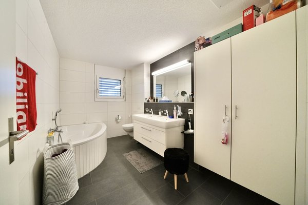 - 1x Badezimmer mit Grosser Badewanne, Doppellavabo, WC und Fenster