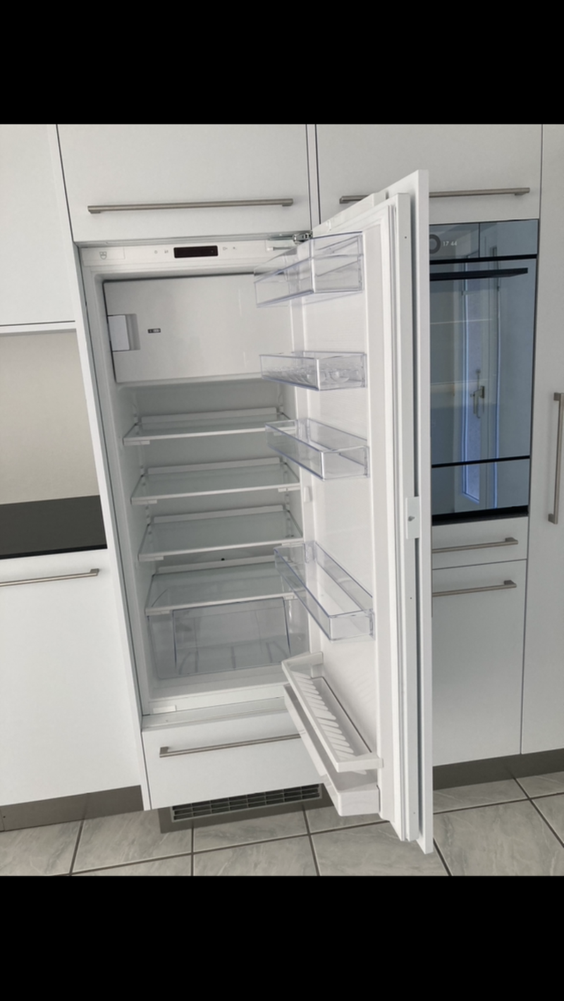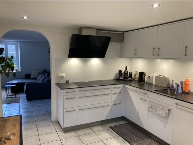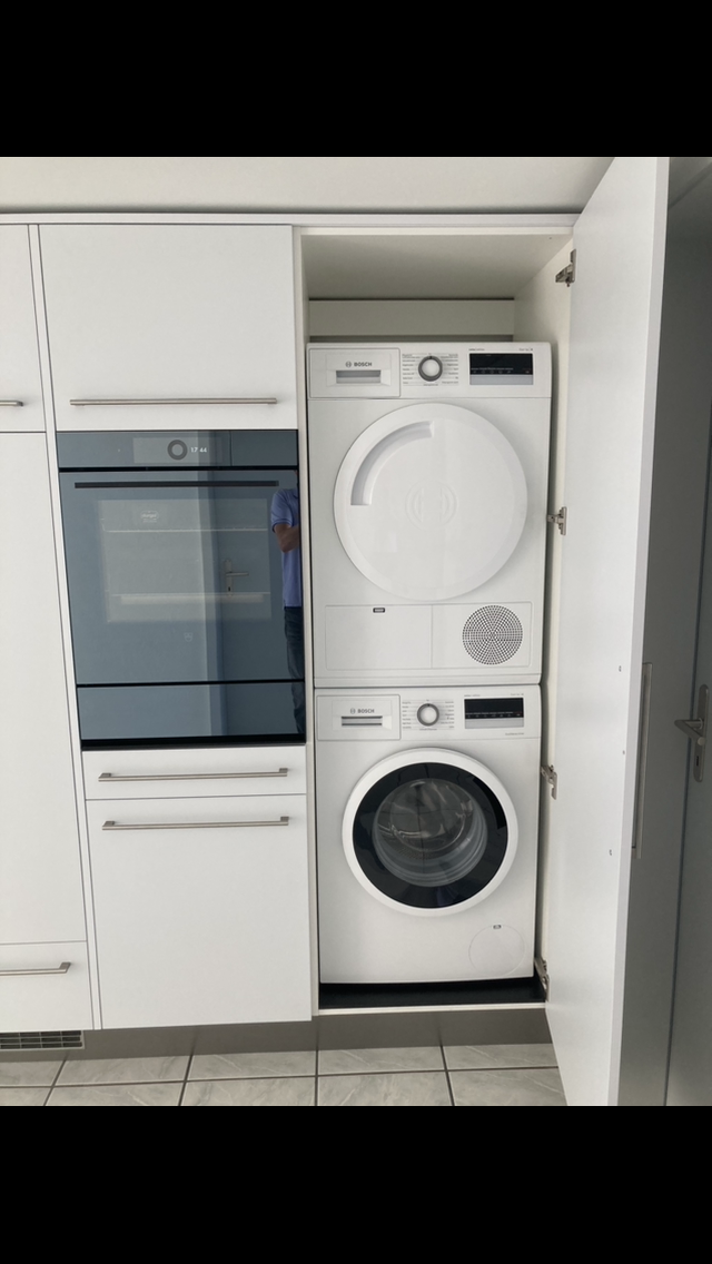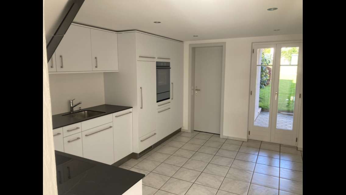 Moderne Küche im Eigentumsstandard mit Backofen/Steamer, Wärmeschublade, Glaskeramik Kochfeld, Arbeitsplatte Vollkern, Geschirrspüler, grosser Kühlschrank, moderner Dampfabzug, Waschmaschine und Trockner.
