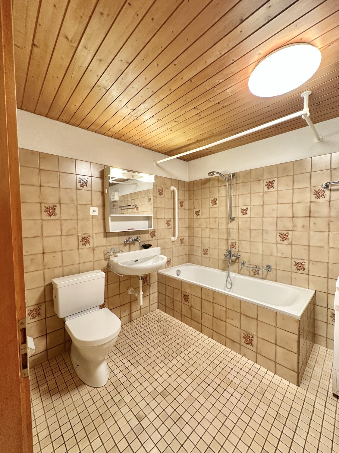 Die Wohnung umfasst ein geräumiges Badezimmer mit Badewanne sowie eine eigene Waschmaschine und einen Tumbler. Darüber hinaus verfügt sie über ein kleines Schlafzimmer, ein großzügiges Wohnzimmer und ein Büro mit einem antiken Holzofen. Ein Geschirrspüler ist ebenfalls vorhanden.