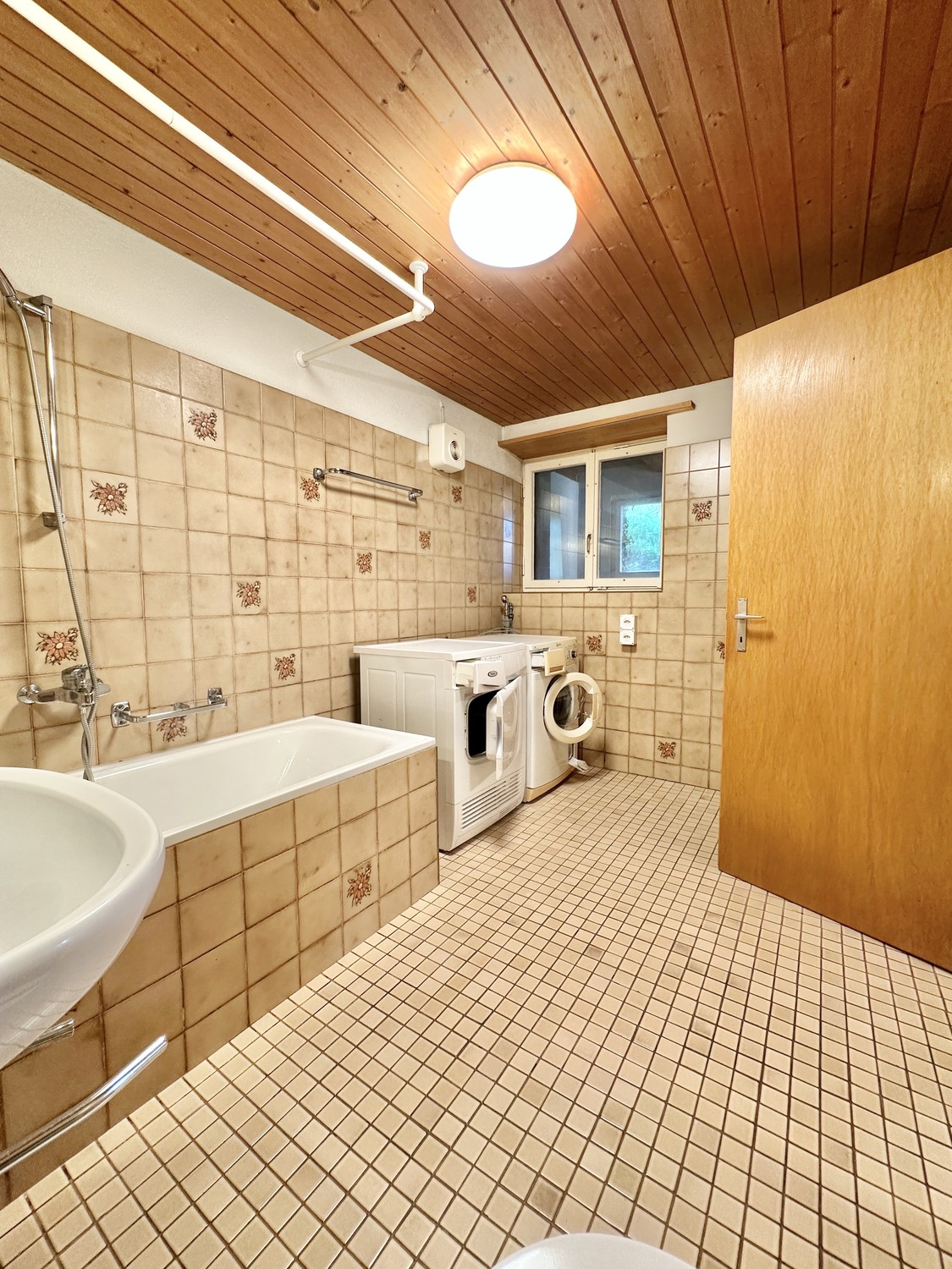 Ein angrenzender Vorraum bietet zusätzlich Stauraum für Gartenutensilien, Rasenmäher und weitere Haushaltsgegenstände.