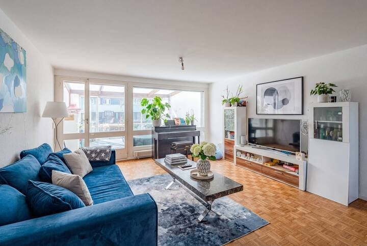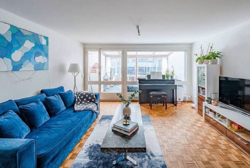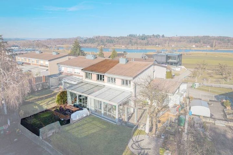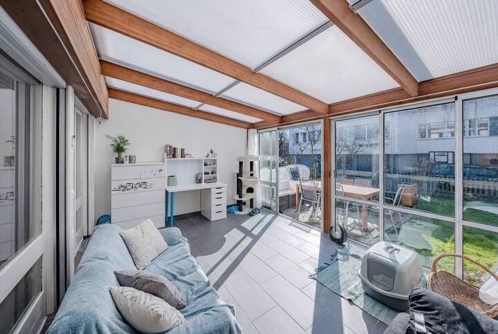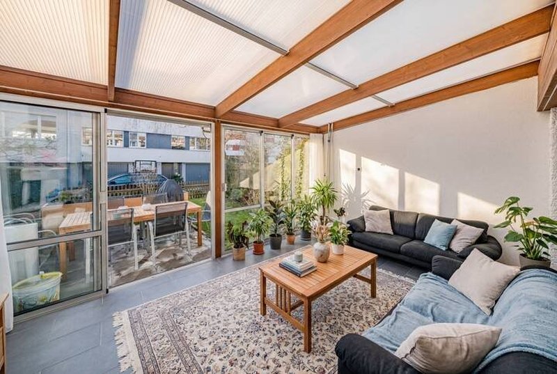 Im Mittelpunkt steht das gemütliche Wohnzimmer mit direktem Zugang zum 15 m² grossen Wintergarten. Dank Elektrostoren lässt sich dieser flexibel nutzen ? als lichtdurchfluteter Rückzugsort oder als Erweiterung des Wohnraums. Von hier gelangen Sie weiter auf den Gartensitzplatz und in den rund 30 m² grossen Garten. Rasenfläche, Hochbeete und verschiedene Sitzmöglichkeiten schaffen eine private, grüne Oase.
