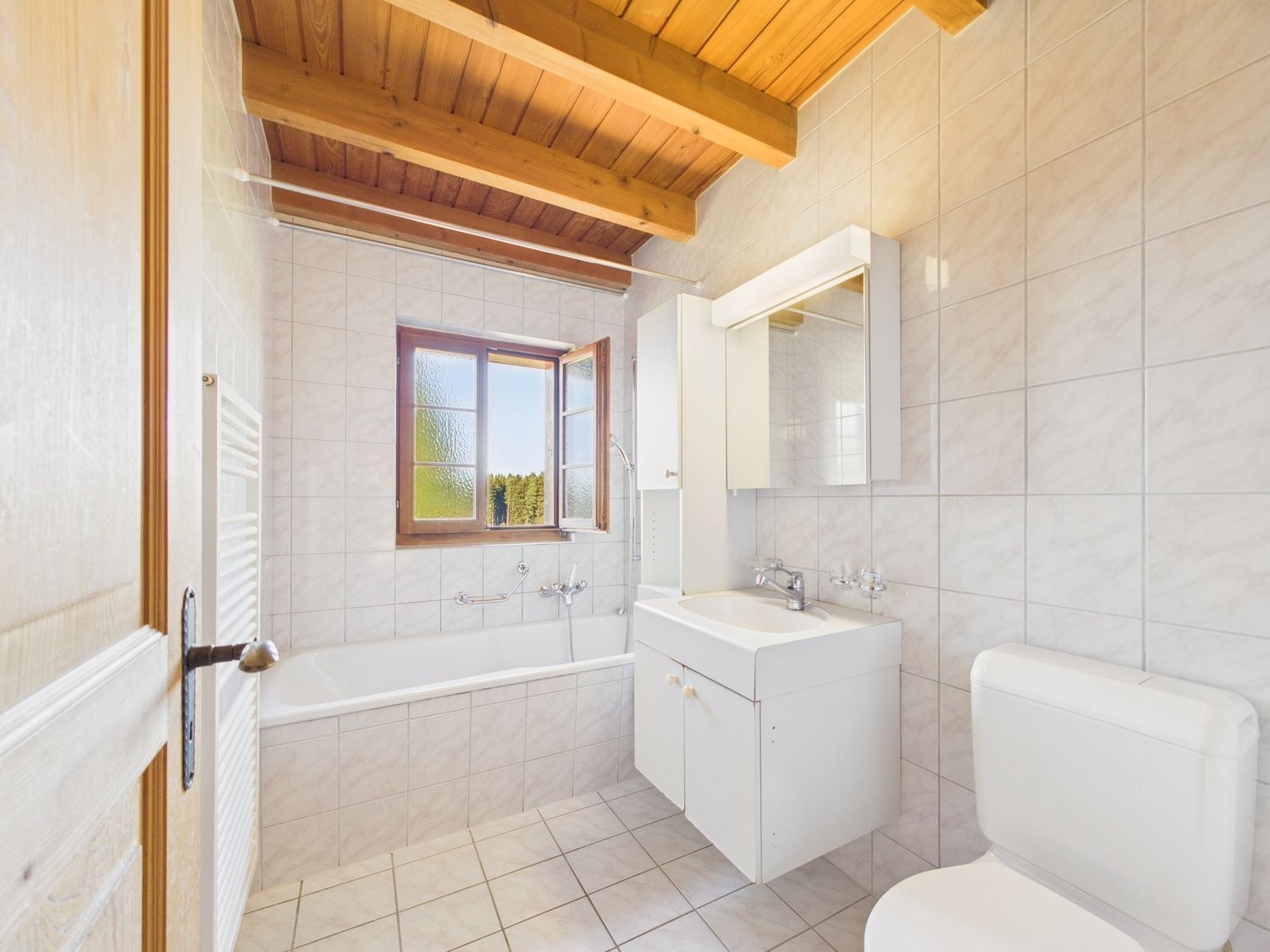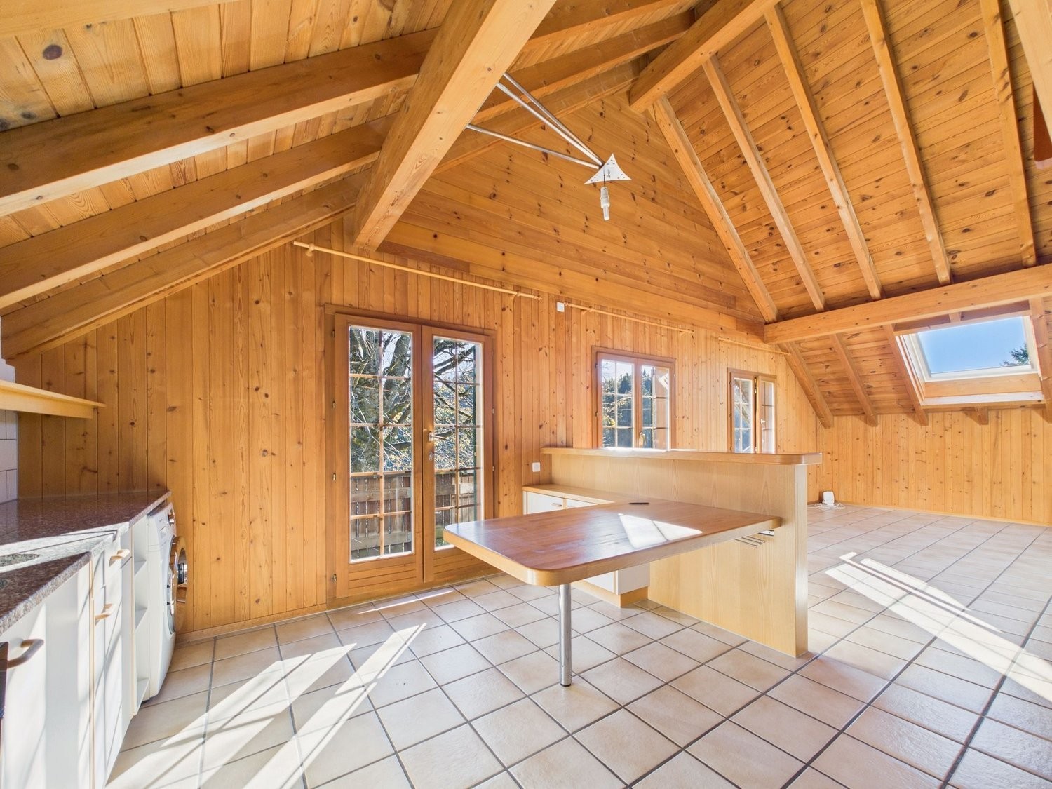 Dank den grossen Fenstern und Dachfenstern ist die Wohnung lichtdurchflutet und wirkt besonders freundlich und warm. Das Badezimmer verfügt über eine Badewanne, WC und Lavabo.