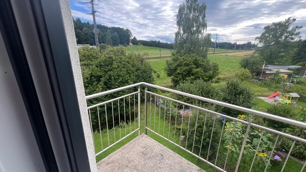 Terrasse und Balkon mit Gartenblick: Wunderschöne Aussicht auf den grünen Garten mit Rasen, Pflanzen, Bäumen und Blumen