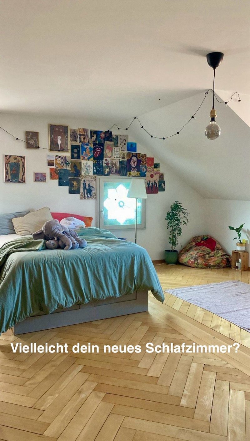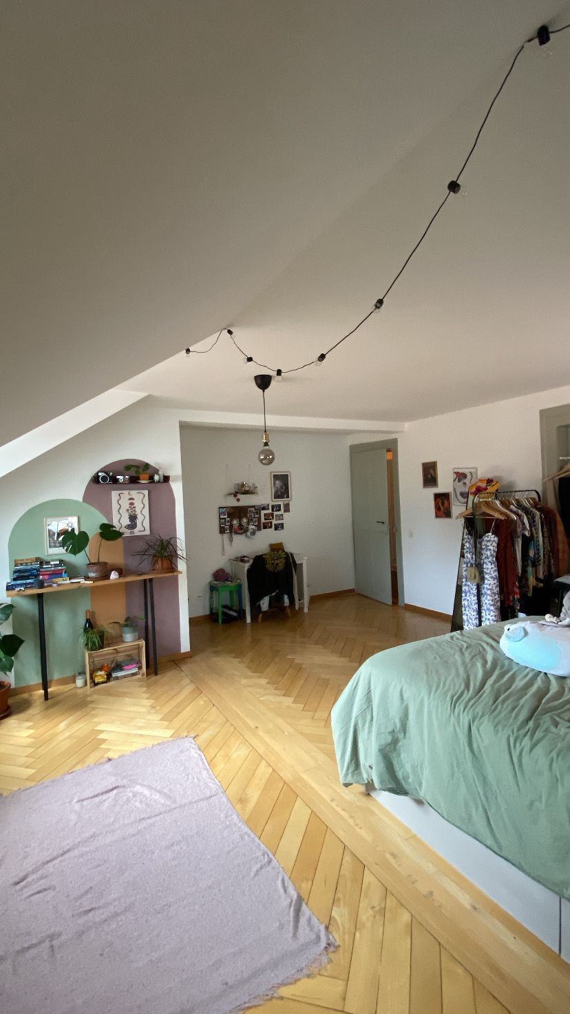 Ein grosses, helles, aktuell möbliertes Zimmer mit Ausrichtung gegen Süden. Im Zimmer befindet sich noch ein Abstellraum, welchen wir aktuell gemeinsam nutzen. Ein Keller und Estrich steht auch zur Verfügung. Ebenfalls sind Waschmaschine und Trockner in der Wohnung vorhanden.