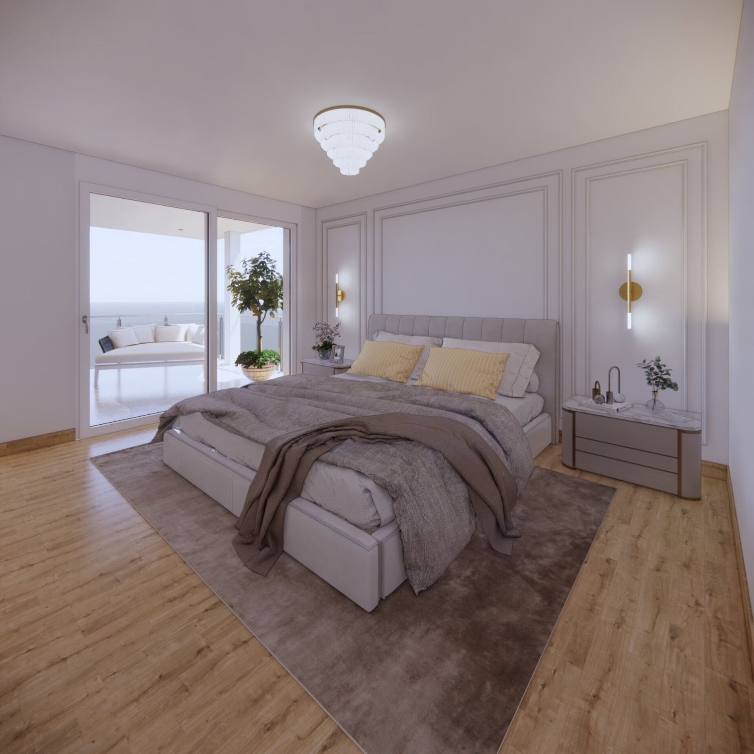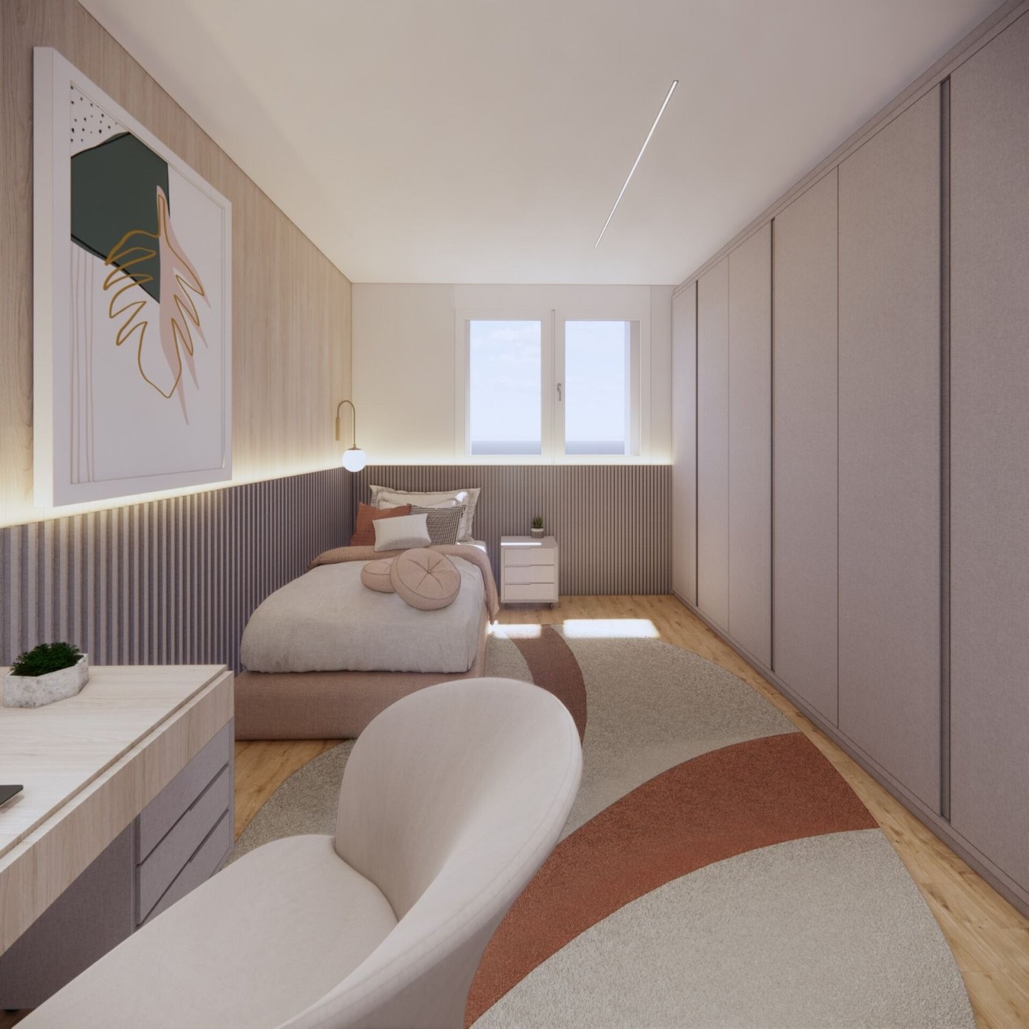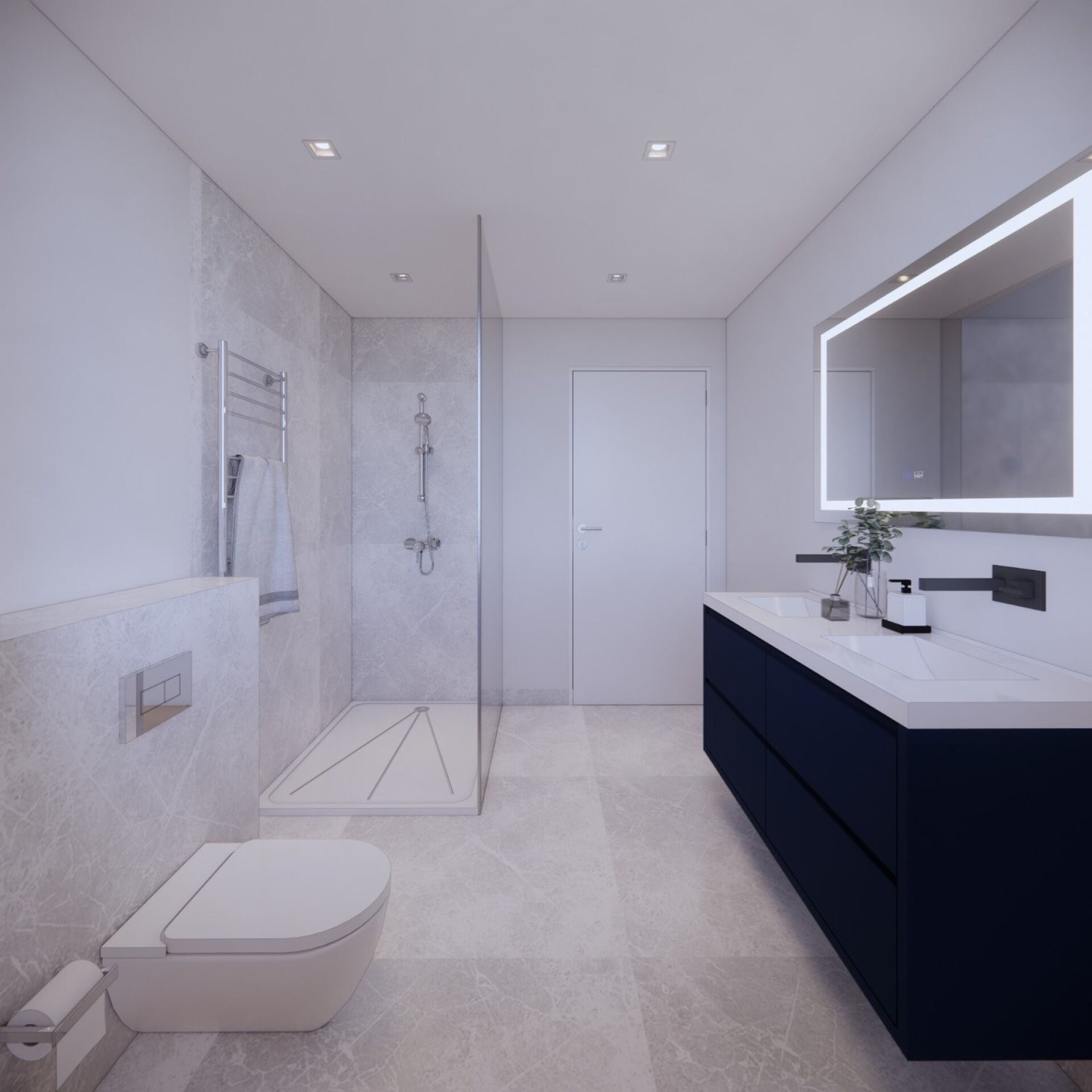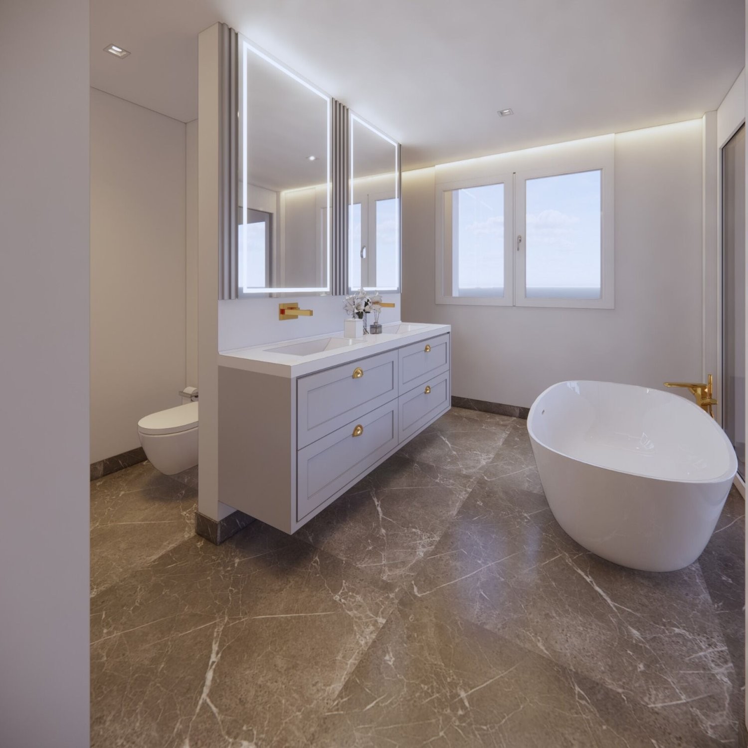 Die Attika erstreckt sich über 184m2, verfügt über einen luxuriösen, zukunftsgerichteten Ausbau mit maximalem Wohnkomfort und ist barrierefrei. Rechts vom Eingangsbereich gehen entlang des Flurs drei Schlafzimmer ab, zudem befindet sich jeweils an einem Flurende ein Bad. Einerseits das Tages-WC neben dem Entrée, andererseits das grosse Bad mit freistehender Badewanne am Ende des Flurs und mit Blick auf die gedeckte Loggia, die über ein Schlafzimmer betreten wird.