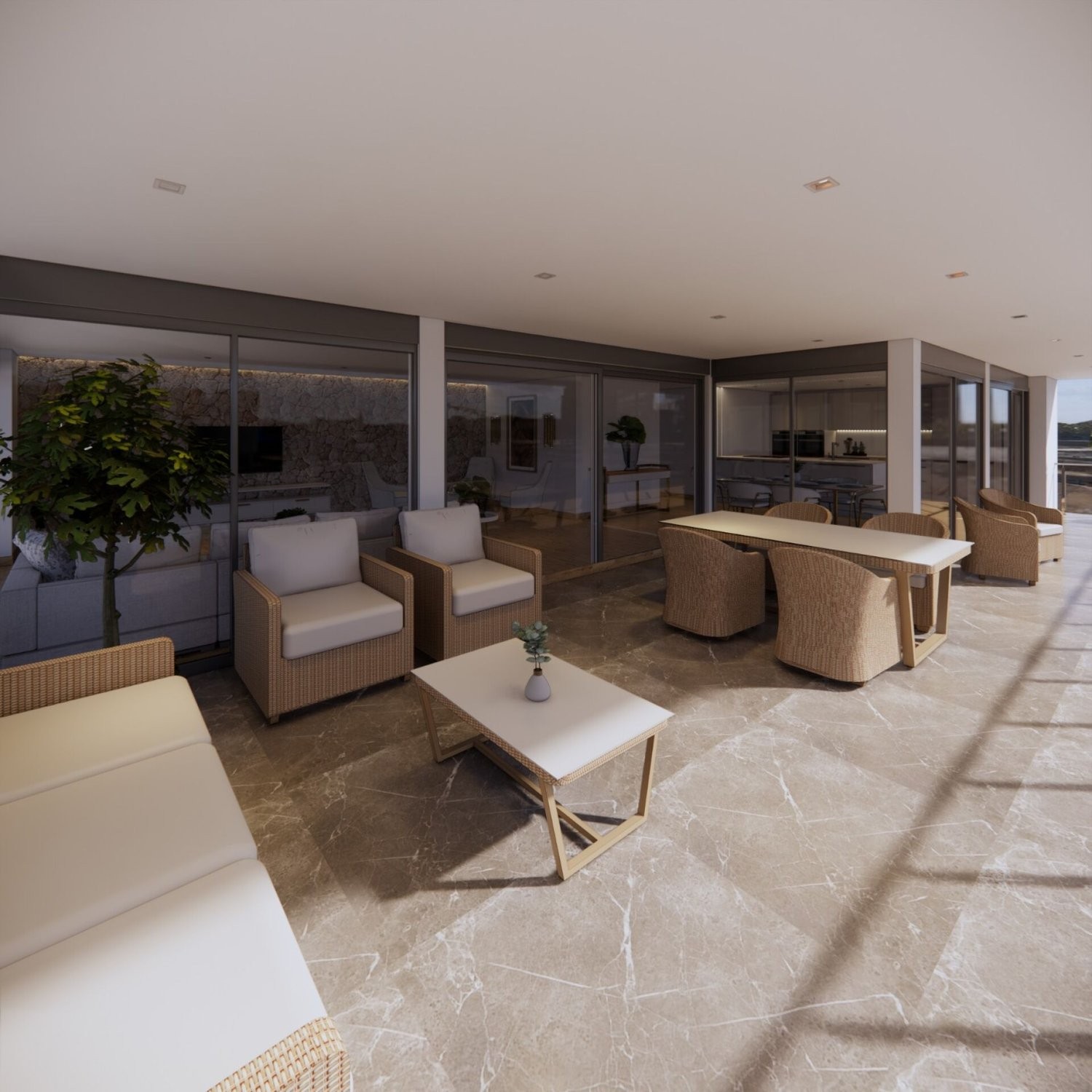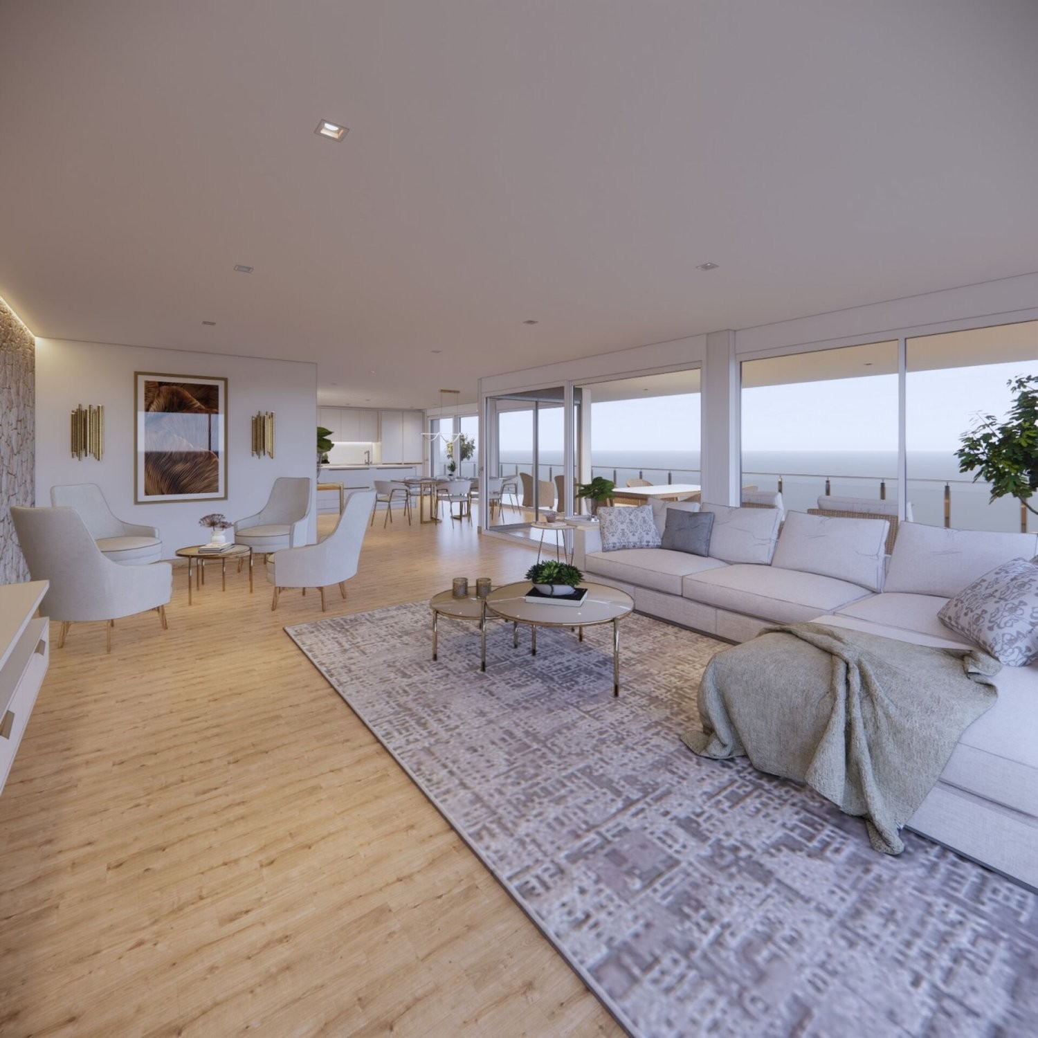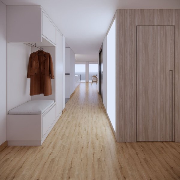 Linkerhand führt das Entrée in den grosszügigen, offenen Wohn- und Essbereich. Die Küche wird mit hochwertigen Geräten und Oberflächen ausgestattet. An der Kochinsel empfangen Sie beispielsweise stilvoll Gäste für einen Aperitif. In der Wohnung werden hochwertige Parkett- und Vinylböden verbaut. Entlang des gesamten Raumes erstreckt sich die grosse, überdachte Terrasse, die viel Platz für Lounge, Grill, Sitzgelegenheiten oder Liegestühle bietet.