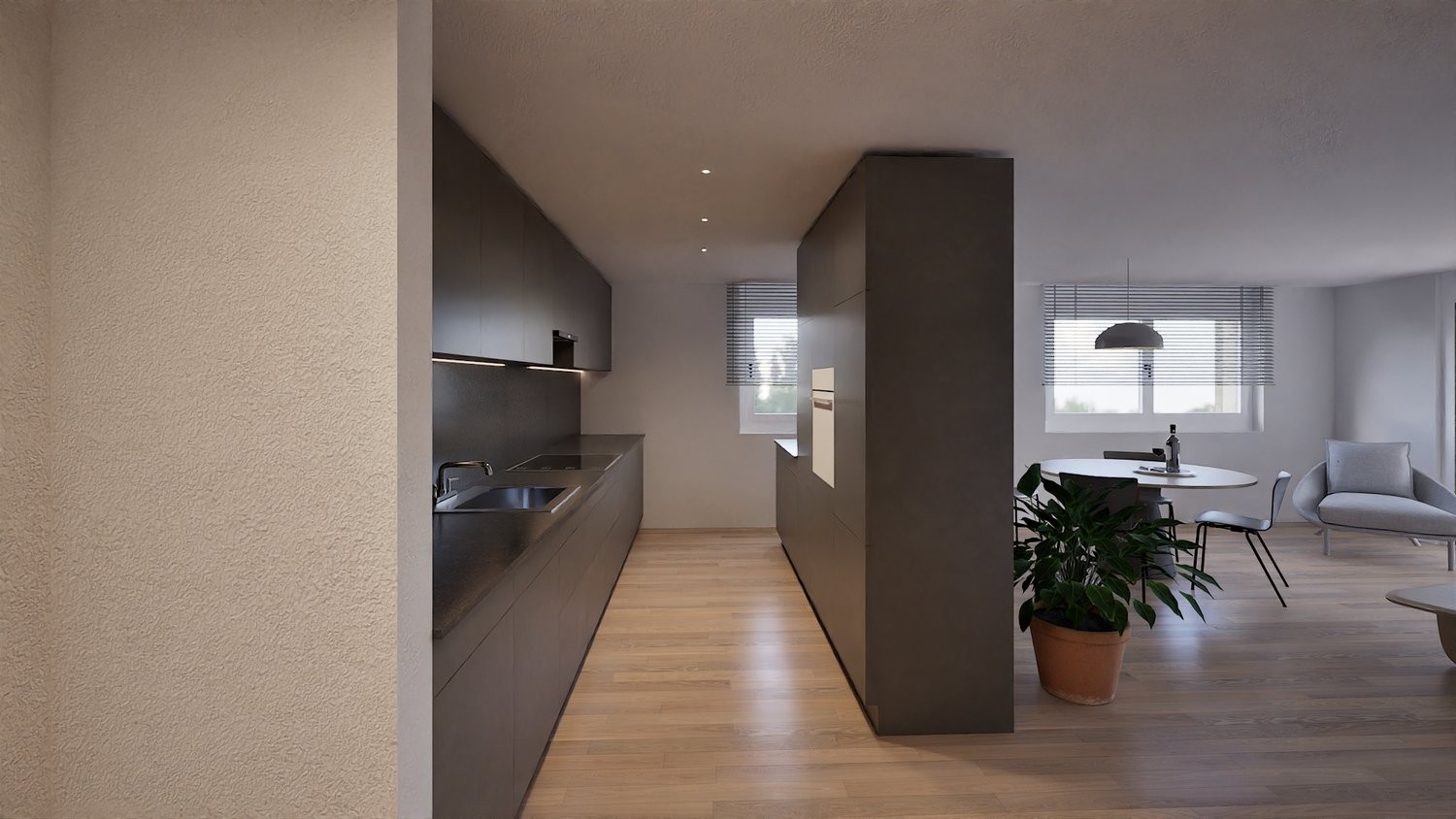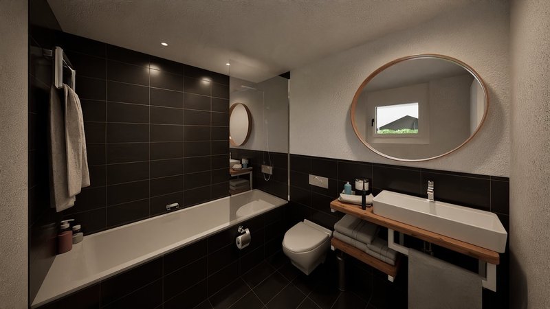 Das Herzstück der Wohnung bildet der grosszügige Wohn-, Ess- und Küchenbereich mit direktem Zugang zur weitläufigen Terrasse. Dank grossen Fensterflächen entsteht eine helle und freundliche Wohnatmosphäre. Die Terrasse bietet reichlich Platz zum Entspannen, für gesellige Abende oder zum Geniessen der umliegenden Berglandschaft.