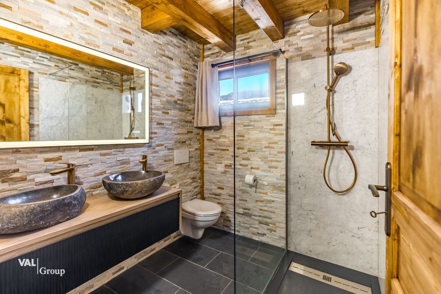 Das Chalet erstreckt sich über drei Etagen mit einer Gesamtfläche von 192 m². Der Wohnbereich im Erdgeschoss umfasst eine offene, hochwertige Küche mit Kühlschrank, Backofen und Geschirrspüler. Edler Parkett- und Schieferboden, kombiniert mit stilvollen Wandverkleidungen aus Massivholz und Naturstein sowie rustikalen Holzbalkendecken, schaffen ein gemütliches und luxuriöses Ambiente.
