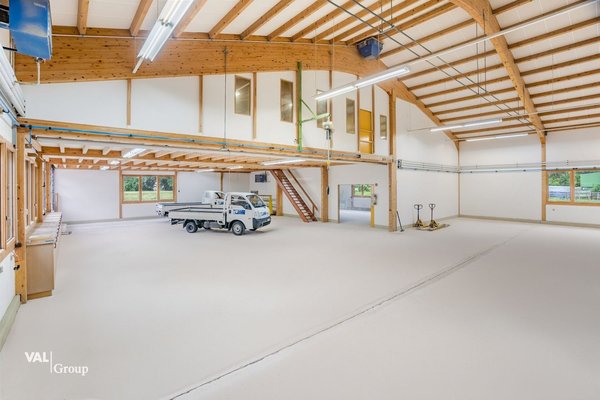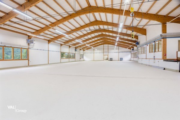 Die helle Halle bietet viel Platz für Produktion und Lagerung, sie ist robust aus einer Kombination von Massivbau und Holzkonstruktion erbaut und verfügt über hohe Decken, was einerseits eine luftige Atmosphäre schafft und andererseits zusätzlichen Platz eröffnet. Die Halle befindet sich in tadellosem Zustand, es wurden hochwertige Materialien eingesetzt und Wartungen wurden regelmässig durchgeführt. Sie ist barrierefrei, kommt freundlich und hell daher, was schlussendlich auch potenziellen Kunden positiv auffallen dürfte.