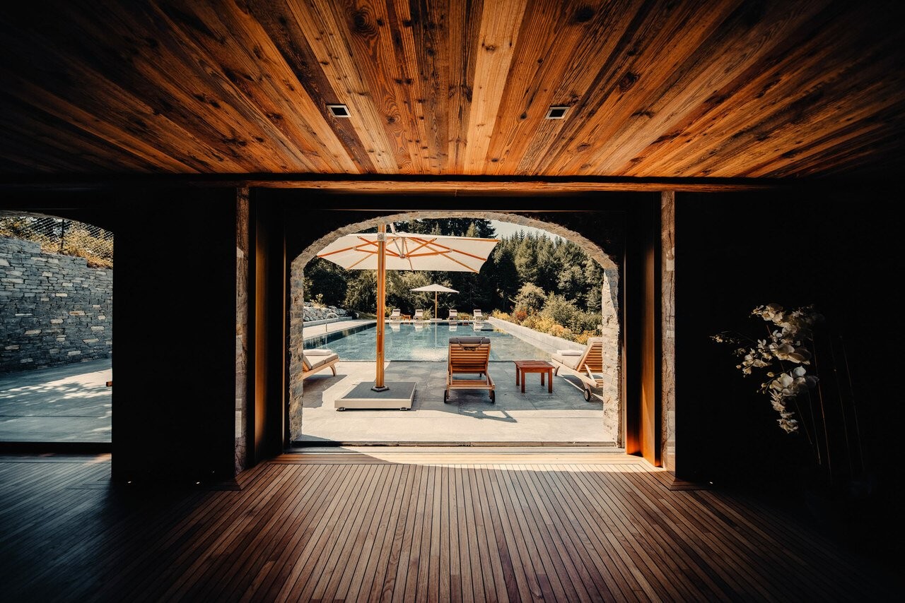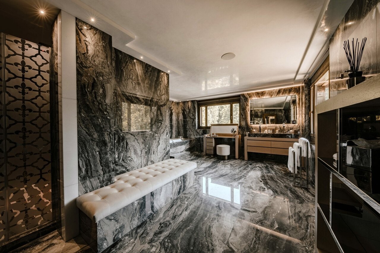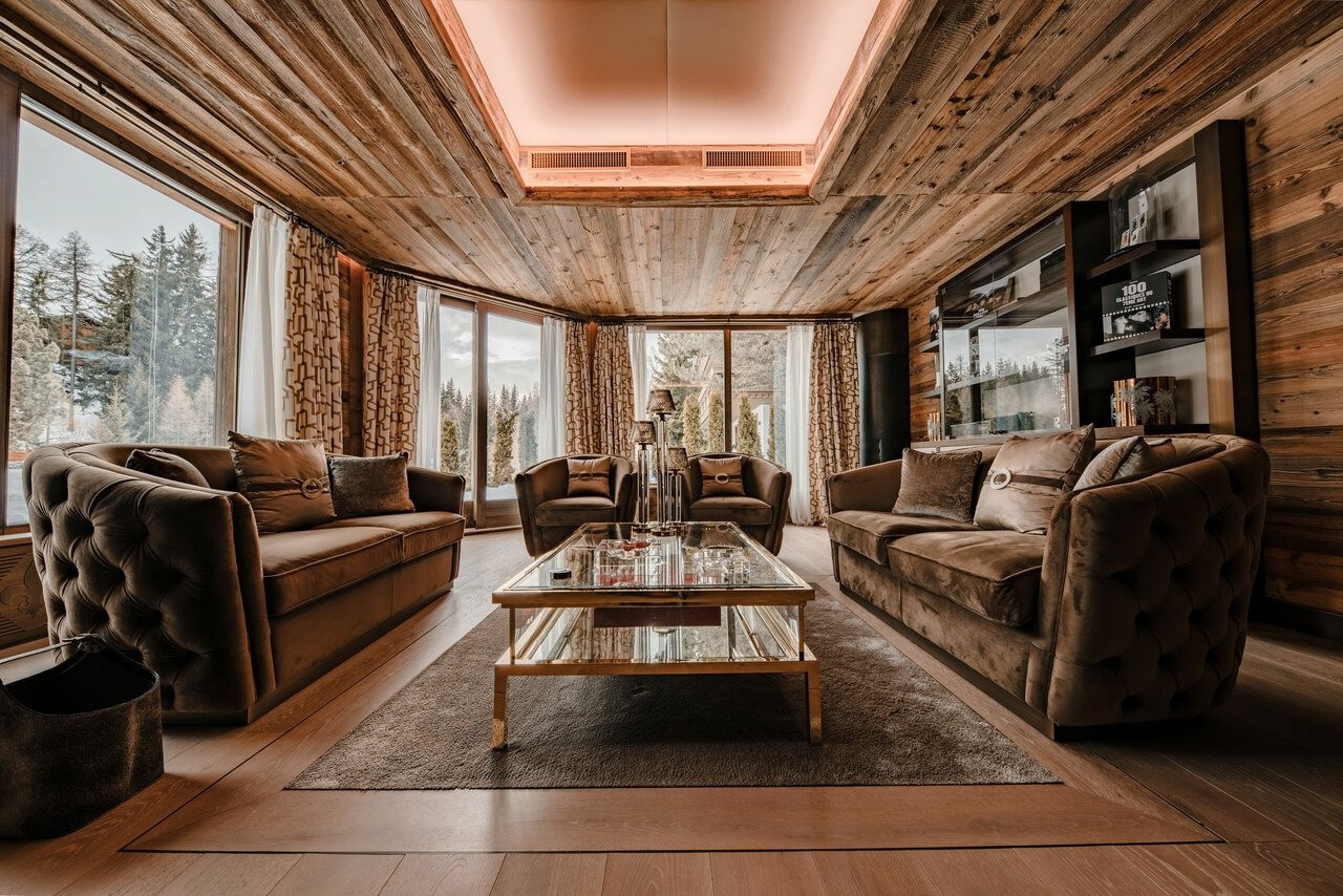 L'architecture intérieure mêle habilement tradition alpine et touches contemporaines de grand luxe, créant une atmosphère à la fois chaleureuse, intimiste et spectaculaire.