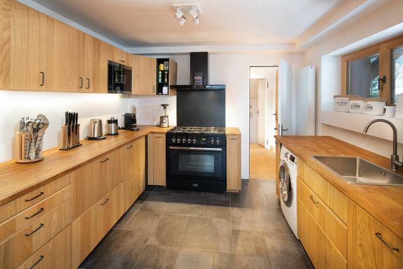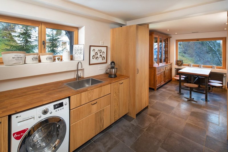 - 1 cuisine complète avec four, cuisinière à gaz, micro-ondes, frigo et congélateur, lave-vaisselle, lave-linge et sèche-linge;