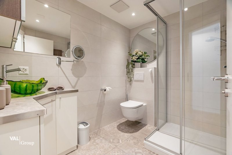 Le séjour lumineux, agrémenté d'un poêle moderne, crée une ambiance accueillante idéale pour se détendre après une journée en montagne. La cuisine, au design épuré et fonctionnel, s'intègre harmonieusement à l'espace de vie, tandis que les chambres offrent une tranquillité absolue grâce à leur situation au rez-de-chaussée surélevé, dans un environnement calme et verdoyant. Deux salles de bain modernes complètent le confort de l'appartement, qui se distingue également par une décoration soignée et un ameublement complet de qualité, inclus dans la location