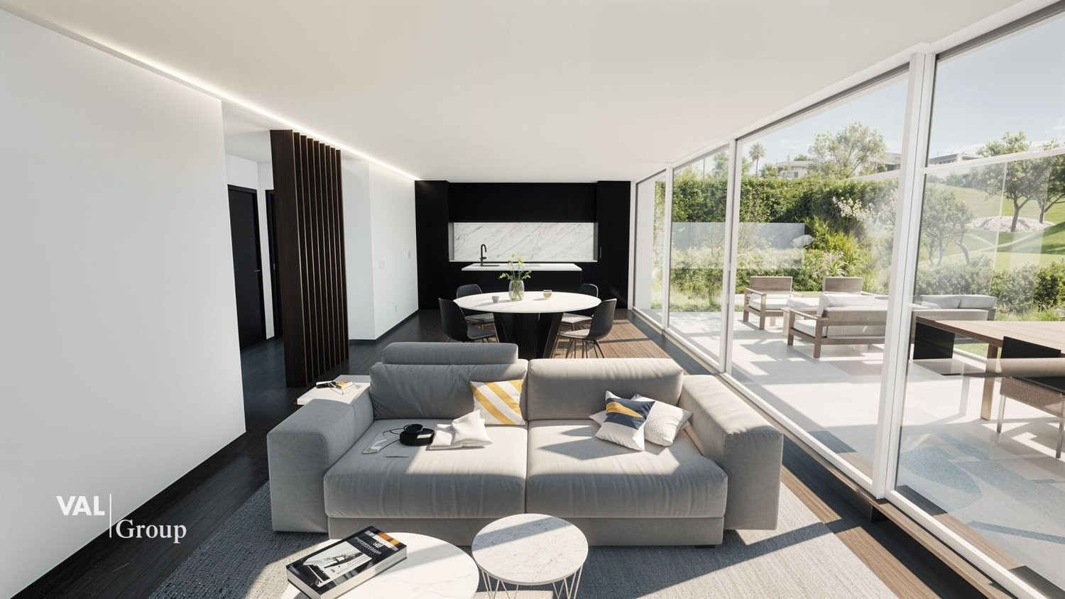 L'entrée s'ouvre sur un bel espace de vie lumineux, dont les finitions soignées mettent en valeur le style contemporain du lieu. La pièce principale, vaste et bien pensée, se prolonge par une grande terrasse extérieure avec un jardin privatif de 135 m². Cet espace extérieur constitue un véritable atout, parfait pour les repas en plein air et les instants de détente avec une vue dégagée sur les montagnes.