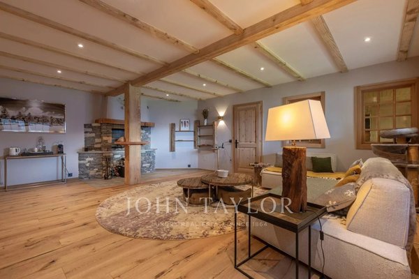- Séjour avec cheminée centrale donnant sur la grande terrasse équipée d'un jacuzzi et à la vue panoramique sur les montagnes et la vallée en contre-bas