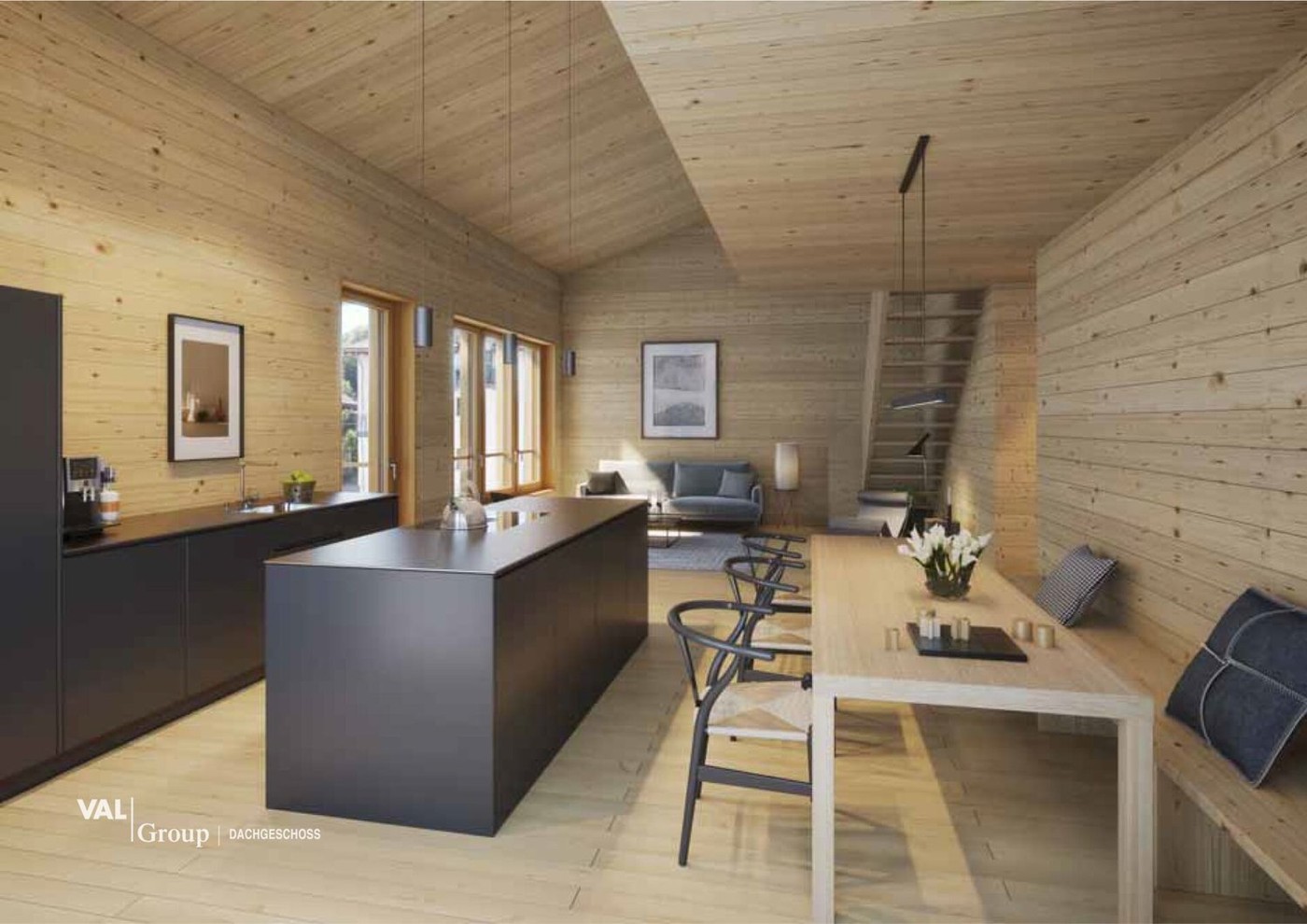 Zum Verkauf steht in diesem aussergewöhnlichen Haus eine 4.5-Zimmer-Maisonettewohnung, die sich über zwei Etagen bis unter das Dach erstreckt. Sie verfügt über eine überdachte Laube auf der Südseite des Gebäudes, auf der Sie von den vielen Sonnenstunden und der herrlichen Aussicht profitieren. Die Wohnung besticht mit ihrer Luftigkeit, aber auch das viele verbaute Holz, welches ideal von den grossen Fenstern ergänzt wird, ist ein besonderer Glanzpunkt. So entsteht die perfekte Kombination zwischen rustikalem Charme und modernstem Komfort. Zwei Nasszellen sowie der grosszügige und weiträumige Ess-, Koch- und Wohnbereich runden die Wohnung ab. Wahlweise kann die Nasszelle zwischen Flur und Wohnzimmer als Reduit oder Tages-WC umgesetzt werden. Vom Wohnzimmer betreten Sie das zweite Stockwerk, in der sich das Elternschlafzimmer mit Ankleide und separatem Bad befindet. Sie haben im Mondhaus "Albert" die Möglichkeit, Ihren Wohntraum individuell auf Ihre Wünsche anzupassen. Für zuzüglich CHF 41'979.- kann die Wohnung inkl. Einbauschränken in allen Schlafzimmern und Wohnzimmer sowie Badezimmermöbel erworben werden. Zur Wohnung gehört zudem ein Keller-Abteil und ein Aussenparkplatz und im Keller befindet sich eine Waschküche zur Einzelnutzung sowie ein gemeinschaftlicher Veloraum. Dank dem Aufzug sind alle Wohnungen rollstuhlgängig und mit Kinderwagen betretbar.