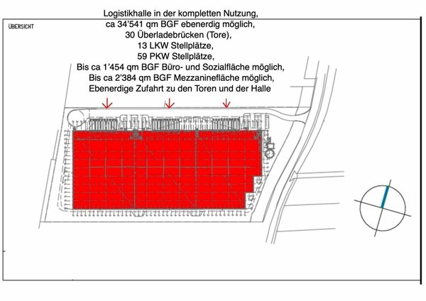 Der Logistikpark umfasst eine Gesamtfläche von ca. 55.000 m² und bietet Hallenflächen von 10.118 m² bis gesamt 30.703 m² BGF. Es sind drei Unterteilungen möglich. Die verfügbaren Einheiten (Unit 1, 2, 3) sind flexibel gestaltbar und verfügen über großzügige Büro- und Sozialflächen.