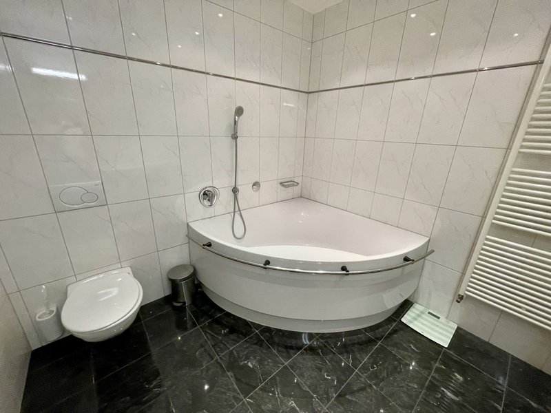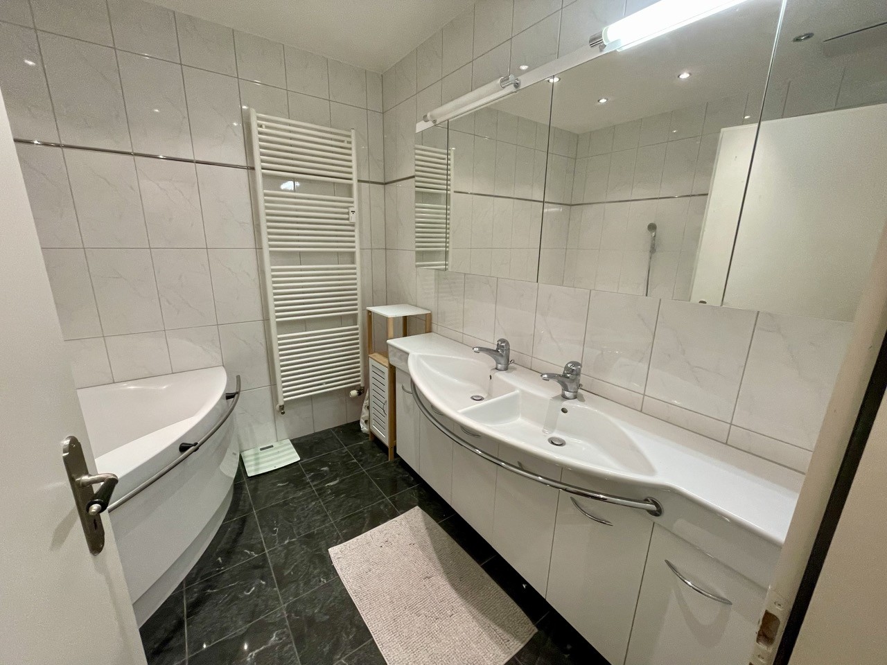 2 Modern Bathrooms: Luxurious bathrooms with white bathtub, double vanity, large mirror, floor heating, elegant black tiles, shower cubicle and ample white storage cabinets